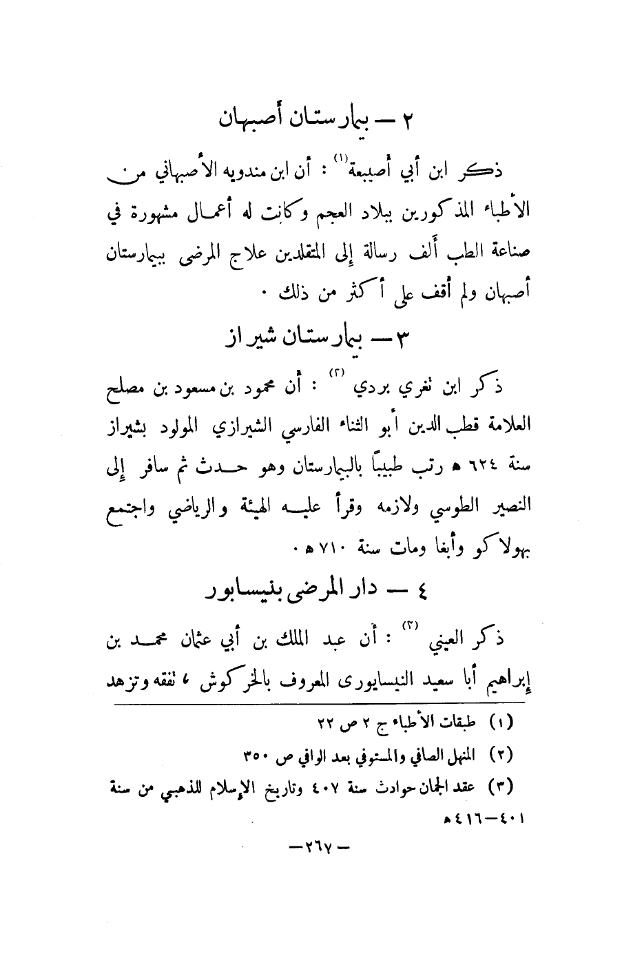 ذكر ابن ثغري بردي: أن محمود بن مسعود بن مصلح العلامة قطب الدين أبو الثناء الفارسي الشيرازي المولود بشيراز سنة 624هـ رتب طبيبا بالبيمارستان وهو