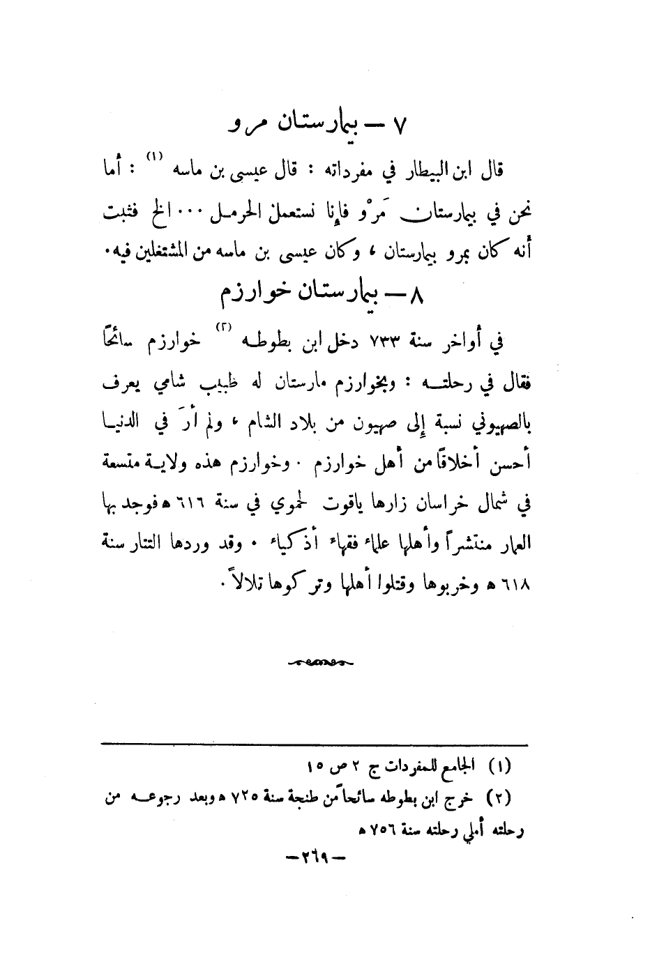 فإنا نستعمل الحرمل. . . الخ فثبت أنه كان بمرو بيمارستان، وكان عيسى بن ماسه من المشتغلين فيه.