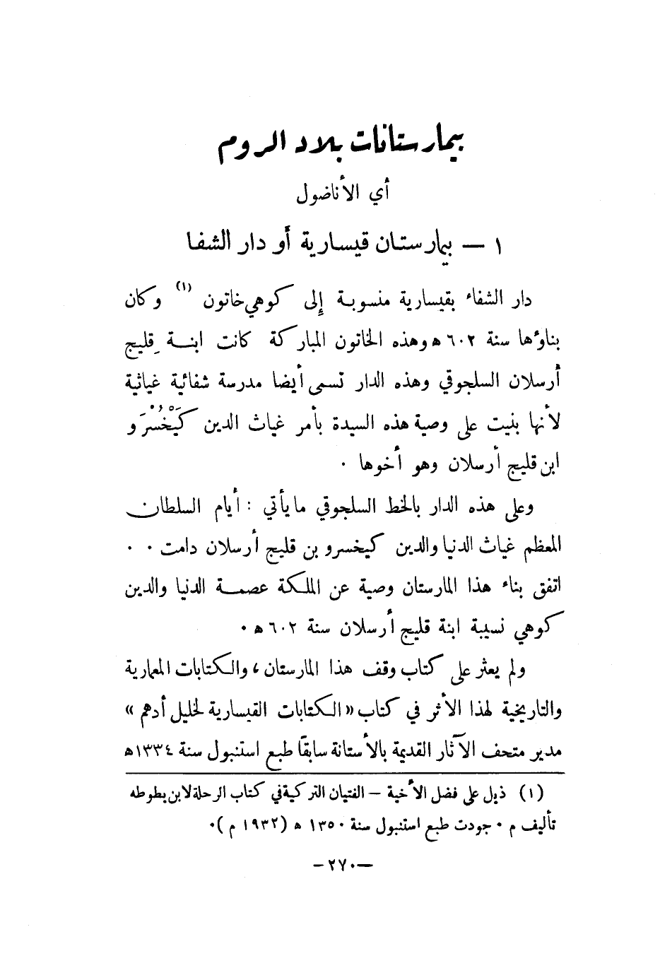 دار الشفاء بقيسارية منسوبة إلى كوهي خاتون وكان بناؤها سنة 602هـ وهذه الخاتون المباركة كانت ابنة قليج أرسلان السلجوقي وهذه الدار تسمى أيضا مدرسة شفائية غياثية لأنها بنيت على وصية هذه السيدة بأمر غياث الدين كيخسرو ابن قليج أرسلان وهو أخوها.
