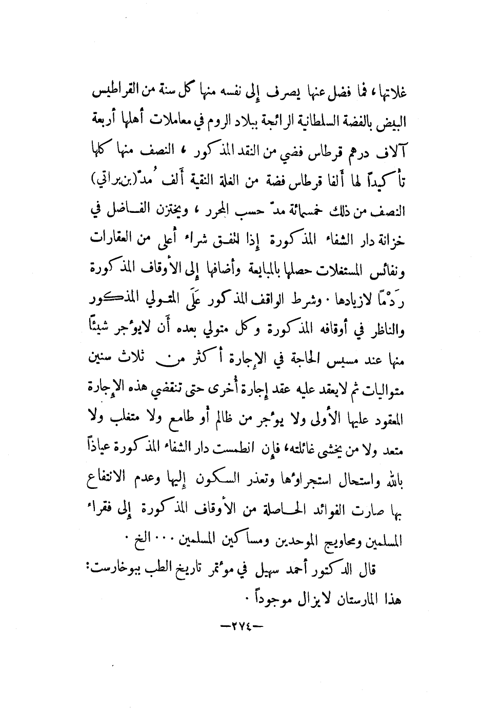 الإجارة أكثر من ثلاث سنين متواليات ثم لا يعقد عليه عقد إجارة أخرى حتى تنقضي هذه الإجازة المعقود عليها الأولى ولا يؤجر من ظالم أو طامع ولا متغلب ولا متعد ولا من يخشى غائلته، فإن انطمست دار الشفاء المذكورة عياذا بالله واستحال استجراؤها وتعذر السكون إليها وعدم الانتفاع بها صارت الفوائد الحاصلة من الأوقاف المذكورة إلى فقراء المسلمين ومحاويج الموحدين ومساكين المسلمين. . . الخ.