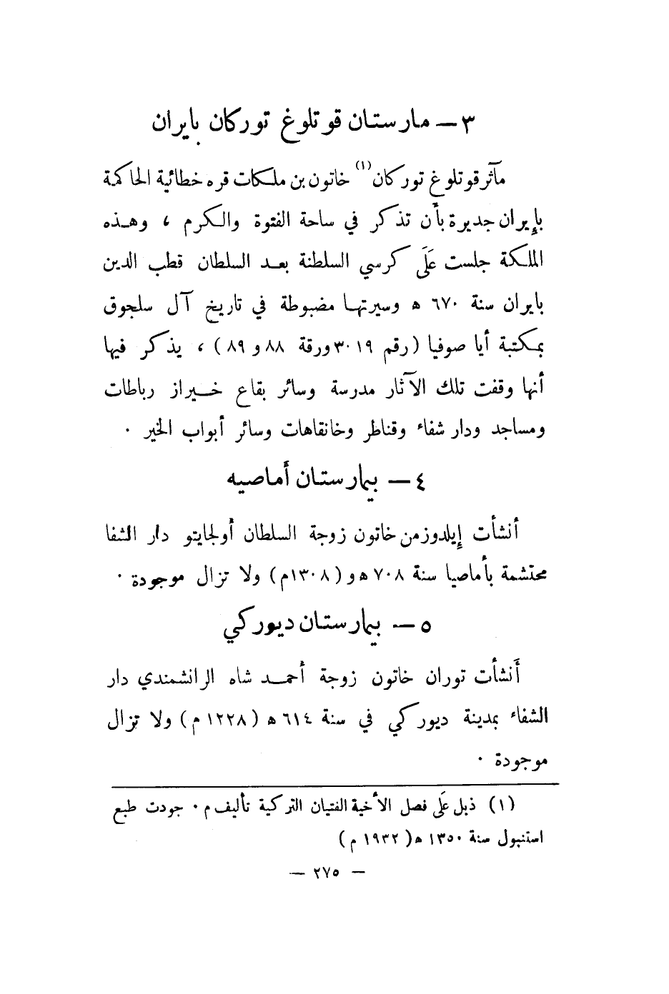 مآثر قوتلوغ تروكان خاتون بن ملكات قره خطائية الحاكمة بإيران جديرة بأن تذكر في ساحة الفتوة والكرم، وهذه الملكة جلست على كرسي السلطنة بعد السلطان قطب الدين بايران سنة 670هـ وسيرتها مضبوطة في تاريخ آل سلجوق بمكتبة أيا صوفيا رقم 3019 ورقة 88 و89، يذكر فيها أنها وقفت تلك الآثار مدرسة وسائر بقاع خيراز رباطات ومساجد ودار شفاء وقناطر وخانقاهات وسائر أبواب الخير.