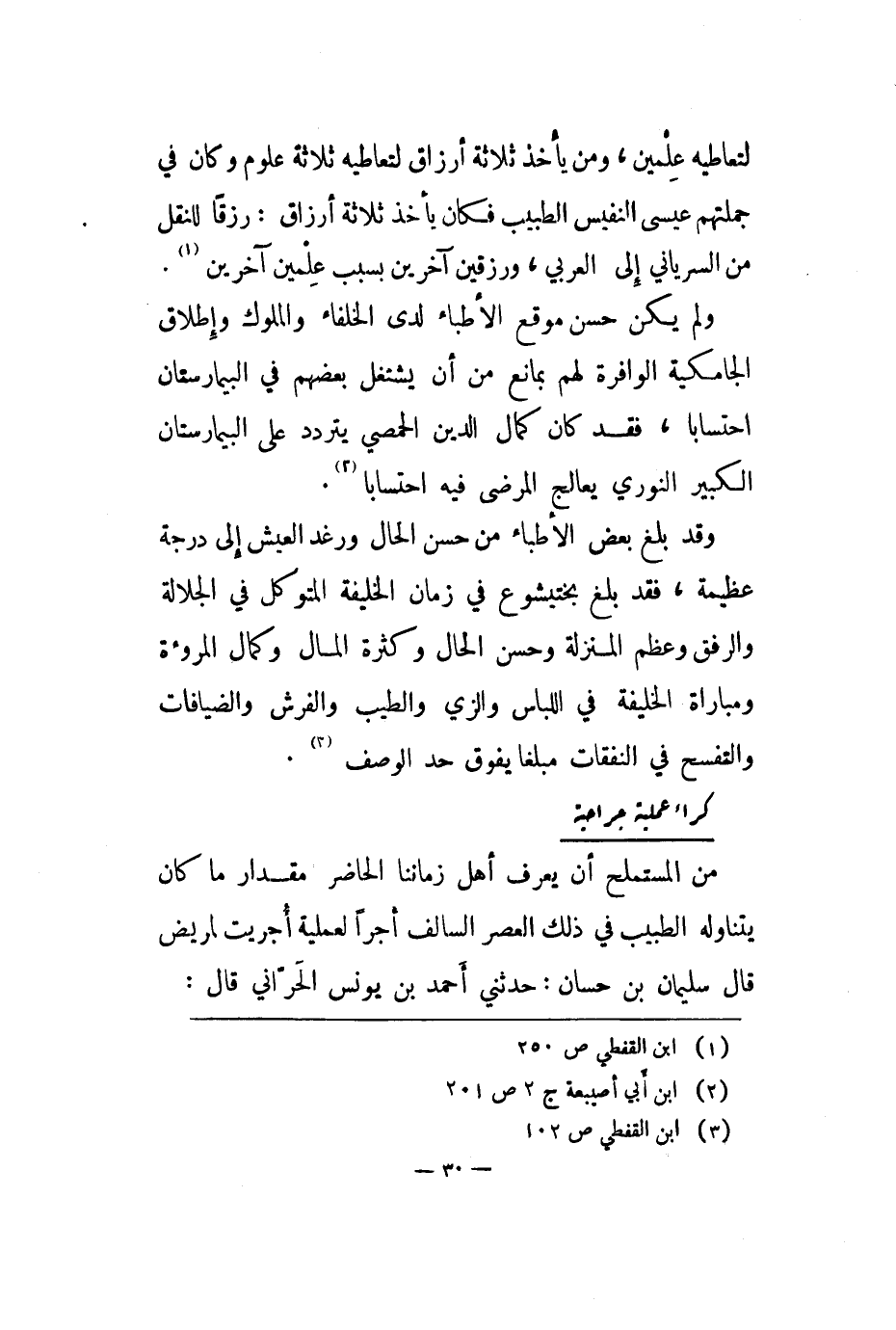 من المستملح أن يعرف أهل زماننا الحاضر مقدار ما كان يتناوله الطبيب في ذلك العصر السالف أجرا لعملية أجريت لمريض قال سليمان بن حسان: حدثني أحمد بن يونس الحراني قال: