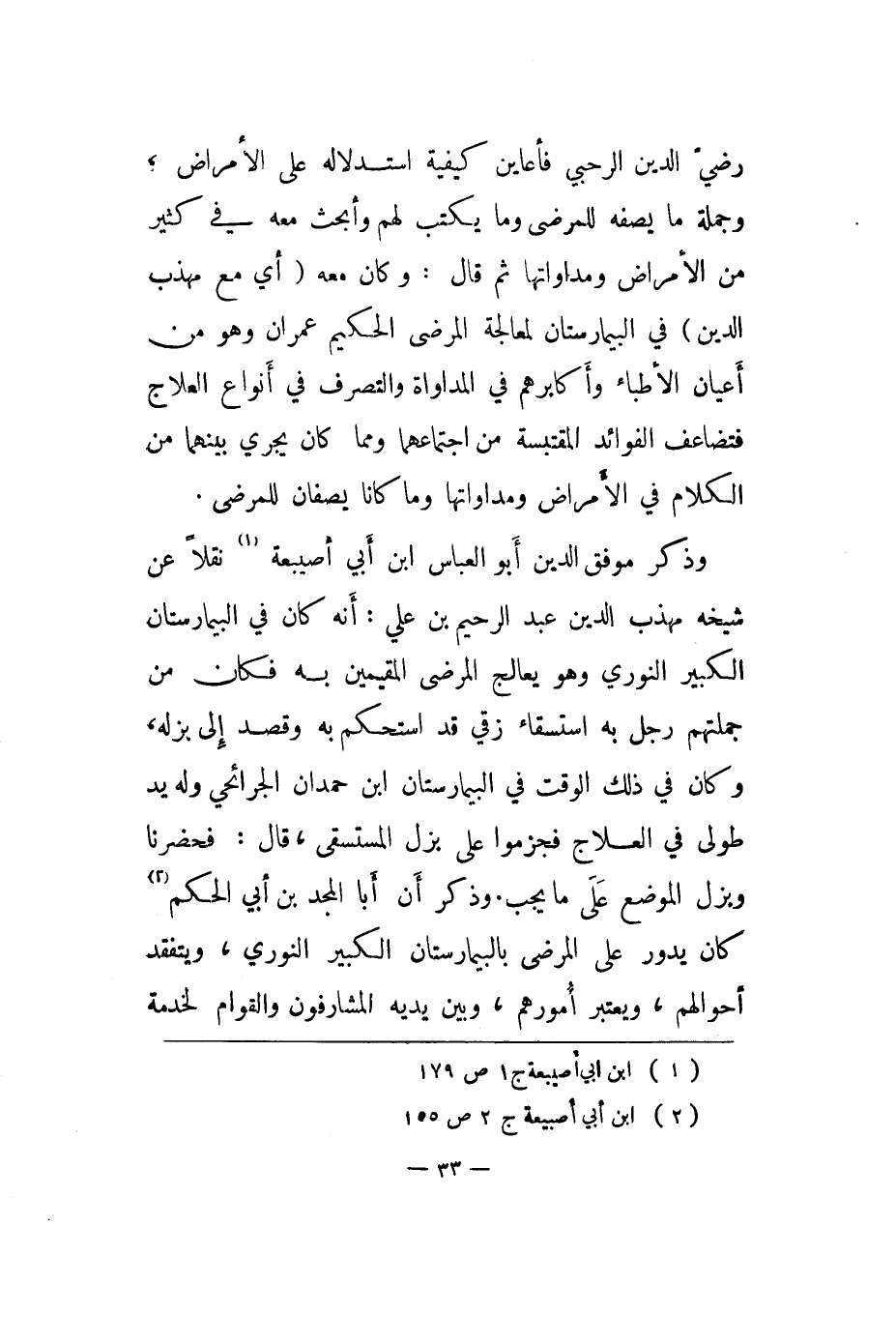 رضي الدين الرحبي فأعاين كيفية استدلاله على الأمراض، وجملة ما يصفه للمرضى وما يكتب لهم وأبحث معه في كثير من الأمراض ومداولتها ثم قال: وكان معه أي مع مهذب الدين في البيمارستان لمعالجة المرضى الحكيم عمران وهو من أعيان الأطباء وأكابرهم في المداواة والتصرف في أنواع العلاج فتضاعف الفوائد المقتبسة من اجتماعهما