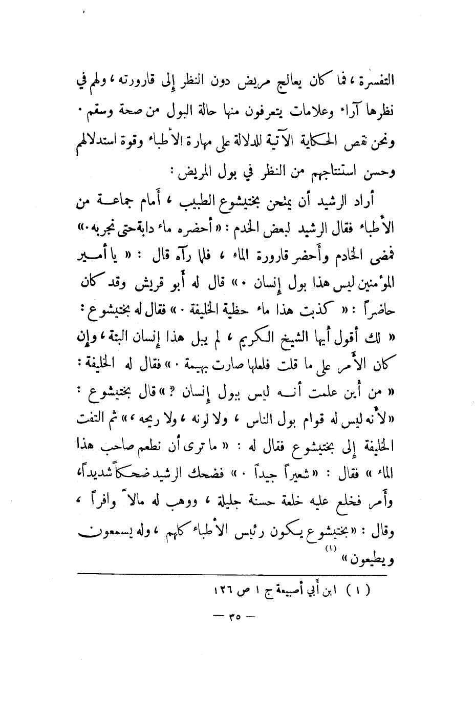 التفسرة، فما كان يعالج مريض دون النظر إلى قارورته، ولهم في نظرها آراء وعلامات يتعرفون منها حالة البول من صحة وسقم. ونحن نقص الحكاية الآتية للدلالة على مهارة الأطباء وقوة استدلالهم وحسن استنتاجهم من النظر في بول المريض:
