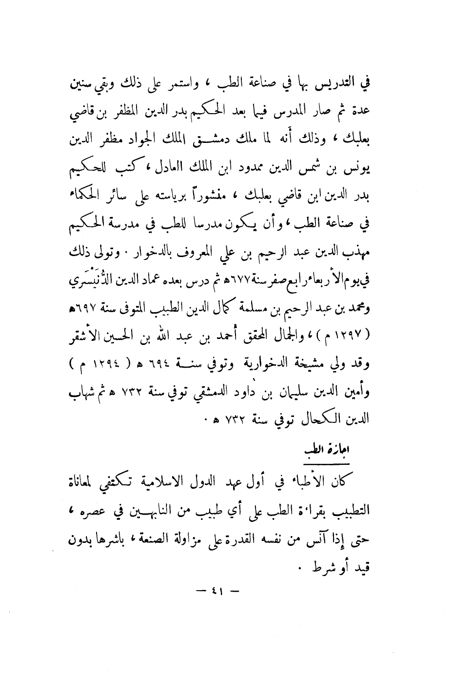 كان الأطباء في أول عهد الدول الإسلامية تكتفي لمعاناة التطبيب بقراءة الطب على أي طبيب من النابهين في عصره، حتى إذا آنس من نفسه القدرة على مزاولة الصنعة، باشرها بدون قيد أو شرط.