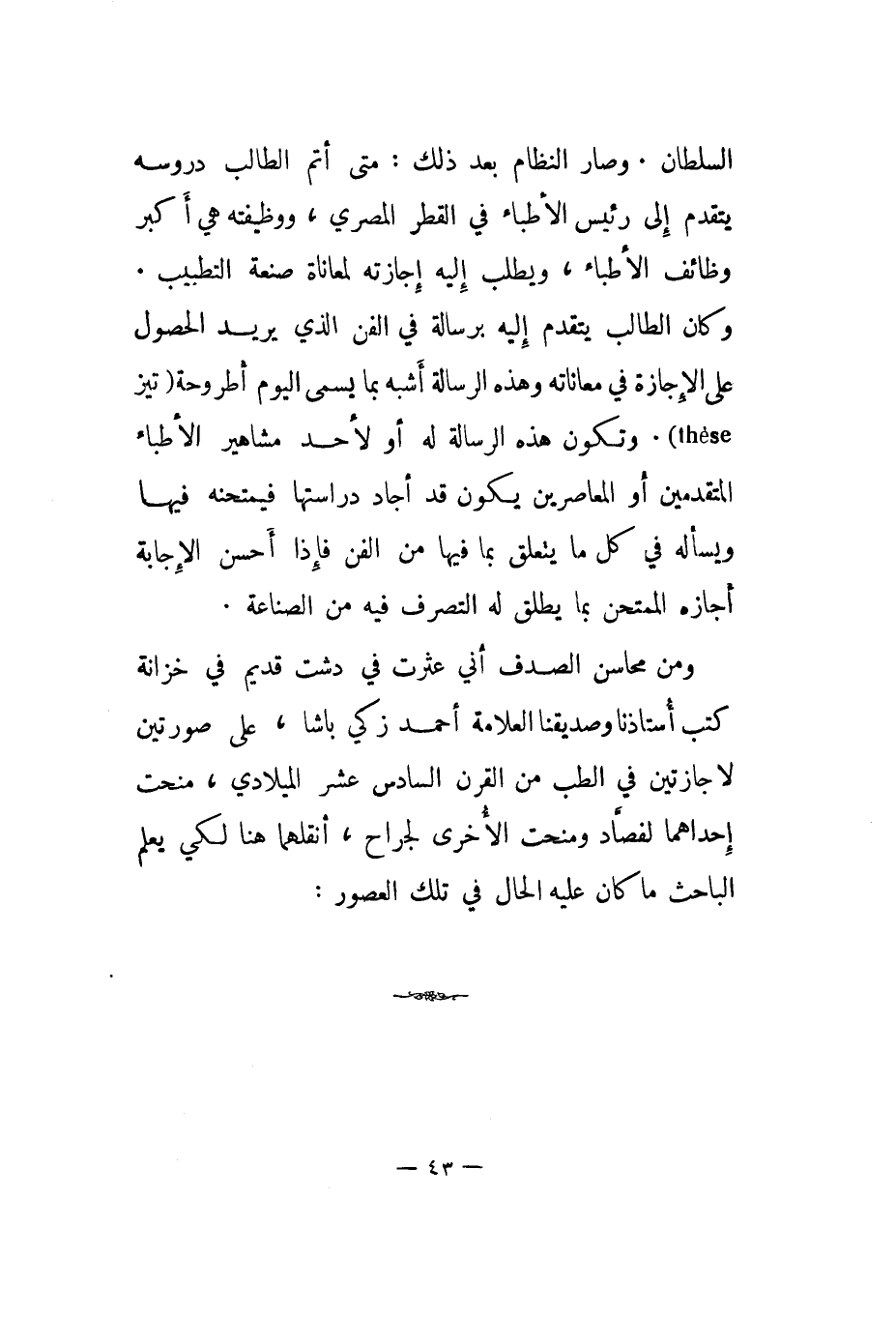ومن محاسن الصدف أني عثرت في دشت قديم في خزانة كتب أستاذنا وصديقنا العلامة أحمد زكي باشا، على صورتين لإجازتين في الطب من القرن السادس عشر الميلادي، منحت إحداهما لفصَّاد ومنحت الأخرى لجراح، أنقلهما هنا لكي يعلم الباحث ما كان عليه الحال في تلك العصور:
