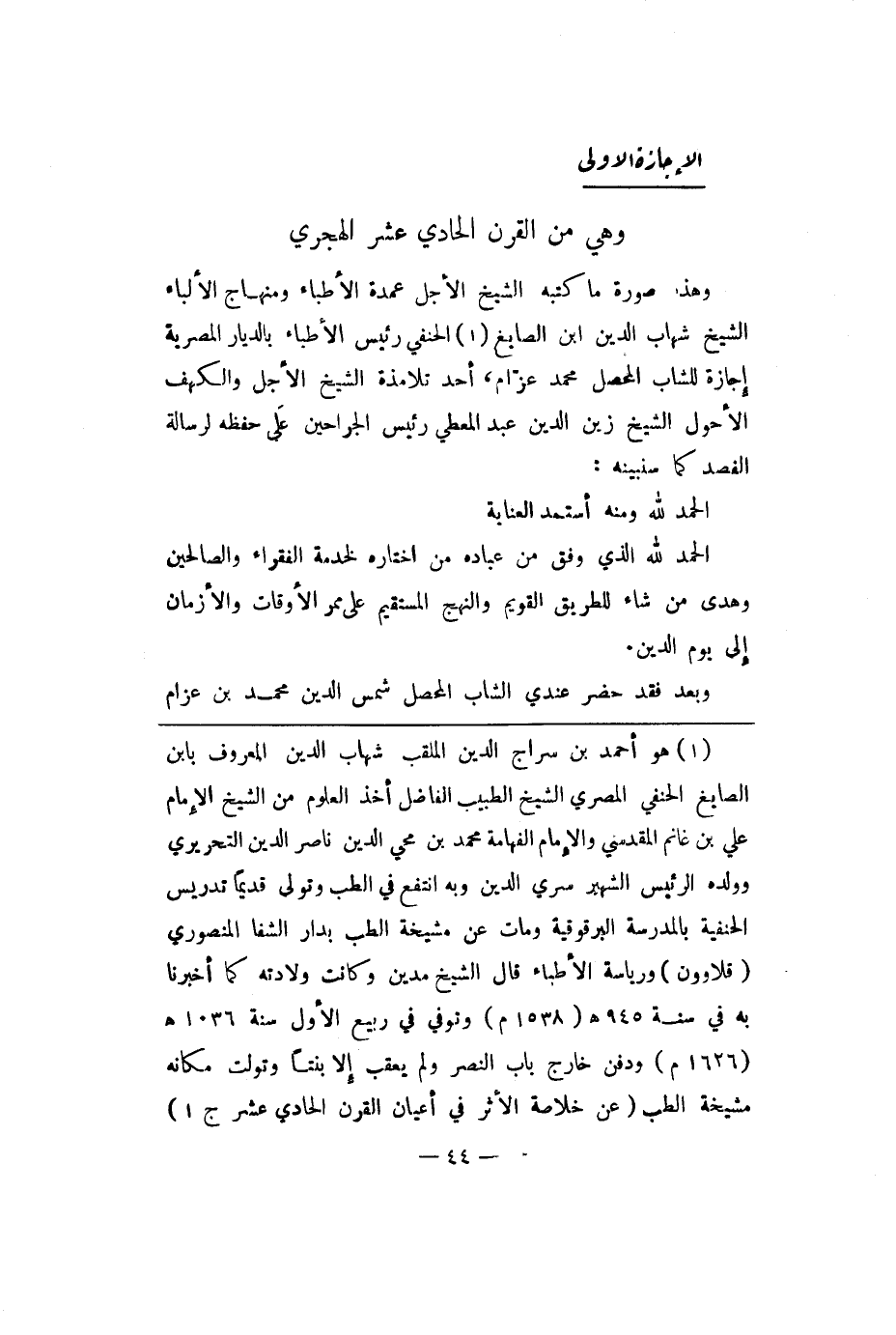 وهذه صورة ما كتبه الشيخ الأجل عمدة الأطباء ومنهاج الألباء الشيخ شهاب الدين ابن الصايغ الحنفي رئيس الأطباء بالديار المصرية إجازة للشاب المحصل محمد عزام، أحد تلامذة الشيخ الأجل والكهف الأحول الشيخ زين الدين عبد المعطي رئيس الجراحين على حفظه لرسالة الفصد كما سنبينه: