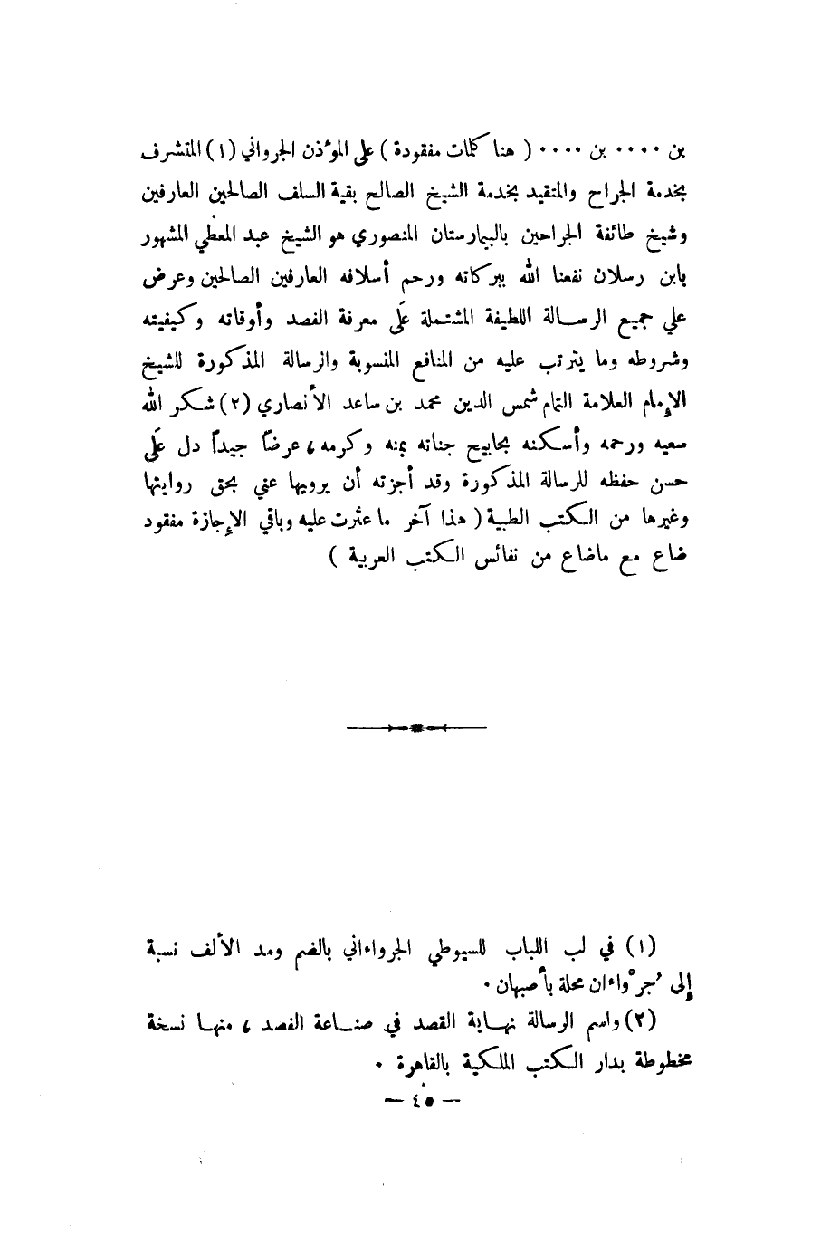 بن. . . بن. . . هنا كلمات مفقودة على المؤذن الجرواني المتشرف بخدمة الجراح والمتقيد بخدمة الشيخ الصالح بقية السلف الصالحين العارفين وشيخ طائفة الجراحين بالبيمارستان المنصوري هو الشيخ عبد المعطي المشهور بابن رسلان نفعنا الله ببركاته ورحم أسلافه العارفين الصالحين وعرض علي جميع الرسالة اللطيفة المشتملة على معرفة الفصد وأوقاته وكيفيته وشروطه وما يترتب عليه من المنافع المنسوبة والرسالة المذكورة للشيخ الإمام العلامة التمام شمس الدين محمد بن ساعد الأنصاري شكر الله سعيه ورحمه وأسكنه بحابيح جناته بمنه وكرمه،