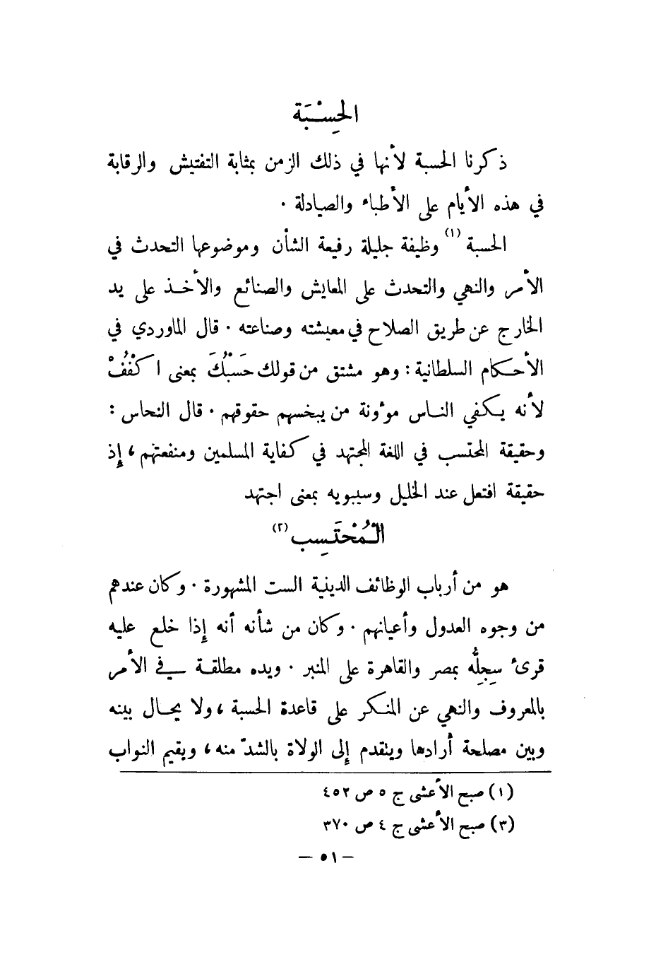 الحسبة وظيفة جليلة رفيعة الشأن وموضوعها التحدث في الأمر والنهي والتحدث على المعايش والصنائع والأخذ على يد الخارج عن طريق الصلاح في معيشته وصناعته. قال الماوردي في الأحكام السلطانية: وهو مشتق من قولك حسبك بمعنى اكفف لأنه يكفي الناس مؤونة من يبخسهم حقوقهم. قال النحاس: وحقيقة المحتسب في اللغة المجتهد في كفاية المسلمين ومنفعتهم، إذ حقيقة افتعل عند الخليل وسيبوية بمعنى اجتهد.