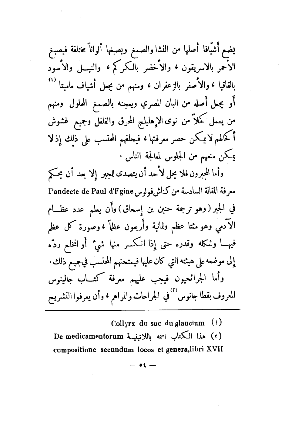 وأما الجرائحيون فيجب عليهم معرفة كتاب جالينوس المعروف بقطا جانوس في الجراحات والمراهم، وأن يعرفوا التشريح