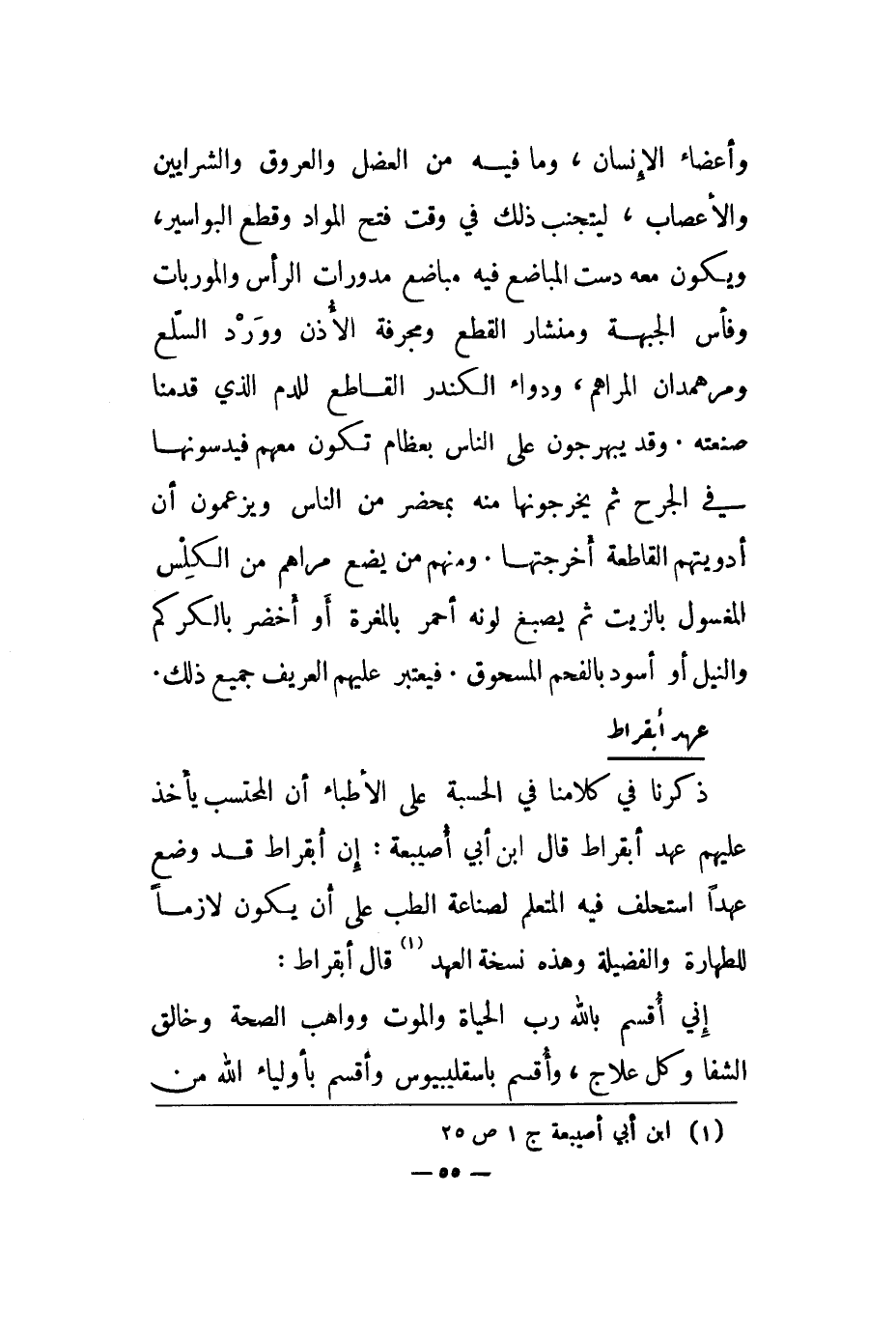 ذكرنا في كلامنا في الحسبة على الأطباء أن المحتسب يأخذ عليهم عهد أبقراط قال ابن أبي أصيبعة: إن أبقراط قد وضع عهدا استحلف فيه المتعلم لصناعة الطب على أن يكون لازما للطهارة والفضيلة وهذه نسخة العهد قال أبقراط: