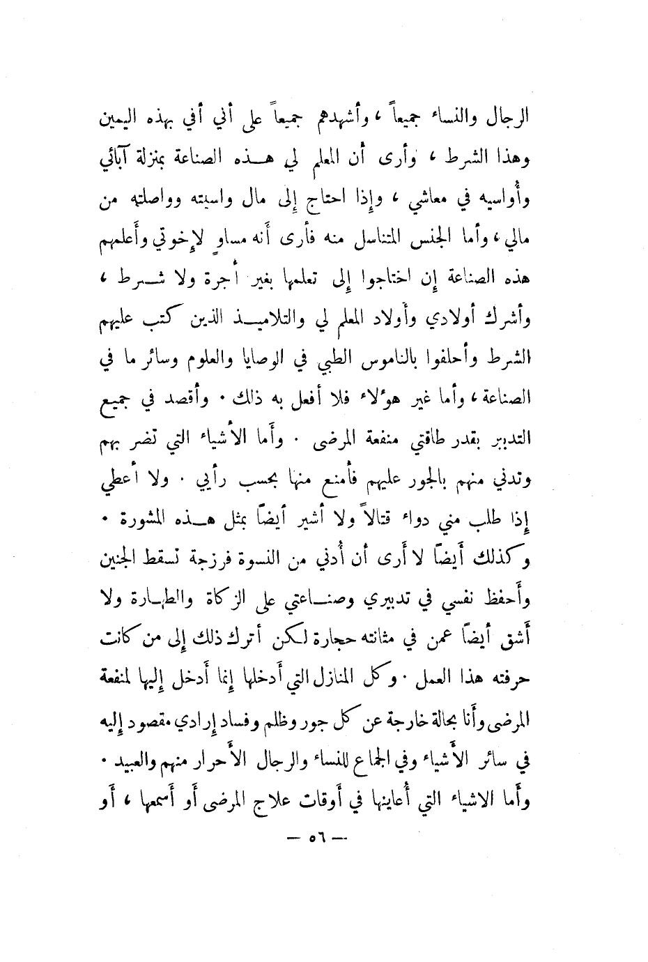 الرجال والنساء جميعا، وأشهدهم جميعا على أني أفي بهذه اليمين وهذا الشرط، وأرى أن المعلم لي هذه الصناعة بمنزلة آبائي وأواسيه في معاشي، وإذا أحتاج إلى مال واسيته وواصلته من مالي، وأما الجنس المتناسل منه فأرى أنه مساو لاخوتي وأعلمهم هذه الصناعة إن احتاجوا إلى تعلمها بغير أجرة ولا شرط، وأشرك أولادي وأولاد المعلم لي والتلاميذ الذين كتب عليهم الشرط وأحلفوا بالناموس الطبي في الوصايا والعلوم وسائر ما في الصناعة، وأما غير هؤلاء فلا أفعل به ذلك. وأقصد في جميع التدبير بقدر طاقتي منفعة المرضى. وأما الأشياء التي تضر بهم وتدني منهم بالجور عليهم فأمنع منها بحسب رأيي. ولا أعطي إذا طلب مني دواء قتالا ولا أشير أيضا بمثل هذه المشورة. وكذلك أيضا لا أرى أن أدني من النسوة فرزجة تسقط الجنين وأحفظ نفسي في تدبيري وصناعتي على الزكاة والطهارة ولا أشق أيضا عمن في مثانته حجارة لكن أترك ذلك إلى من كانت حرفته هذا العمل. وكل المنازل التي أدخلها إنما أدخل إليها لمنفعة المرضى وأنا بحالة خارجة عن كل جور وظلم وفساد إرادي مقصود إليه في سائر الأشياء وفي الجماع للنساء والرجال والأحرار منهم والعبيد. وأما الأشياء التي أعاينها في أوقات علاج المرضى أو أسمعها، أو