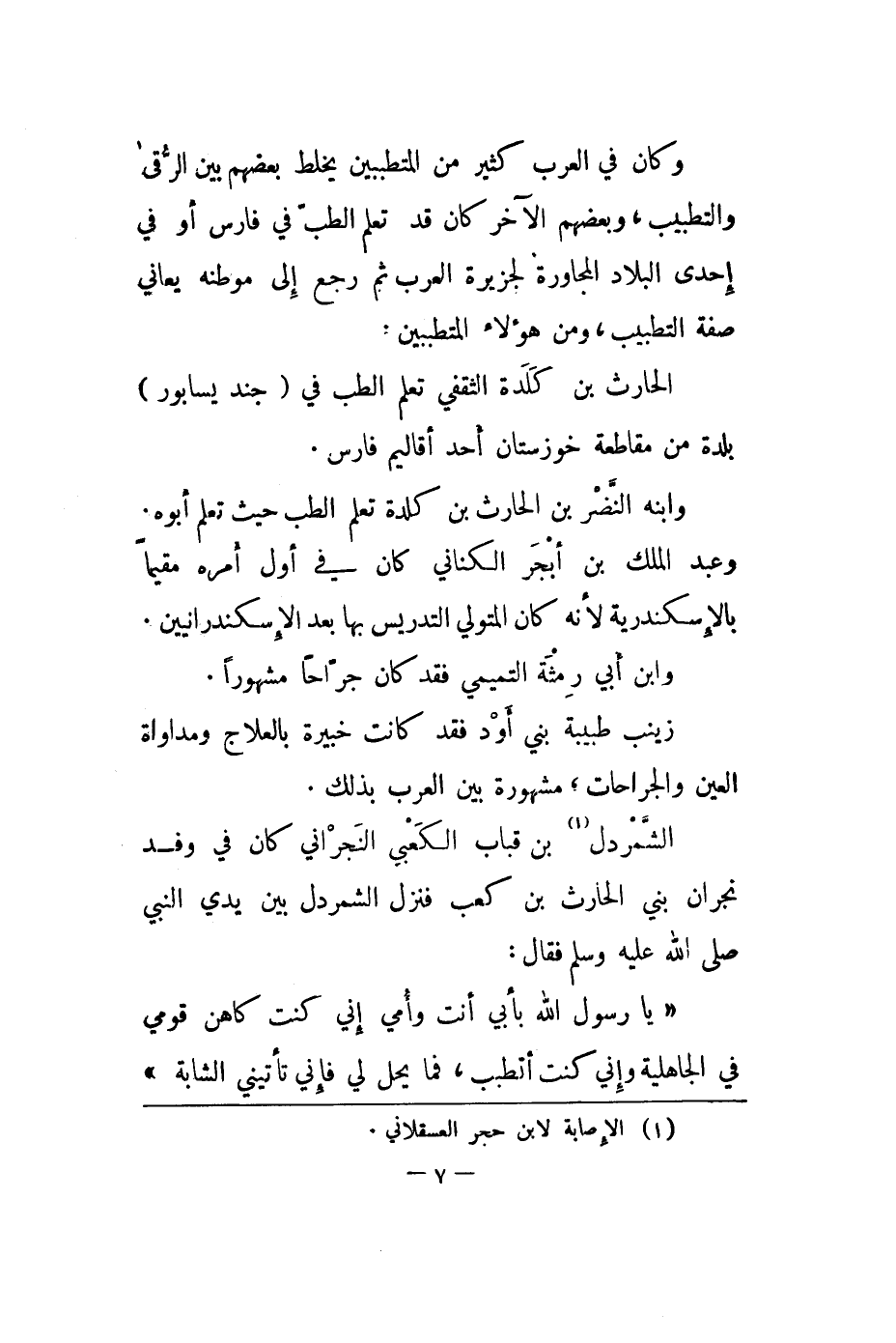 وكان في العرب كثير من المتكببين يخلط بعضهم بين الرُّقى والتطبيب، وبعضهم الآخر كان قد تعلم الطبّ في فارس أو في إحدى البلاد المجاورة لجزيرة العرب ثم رجع إلى موطنه يعاني صفة التطبيب، ومن هؤلاء المتطببين.