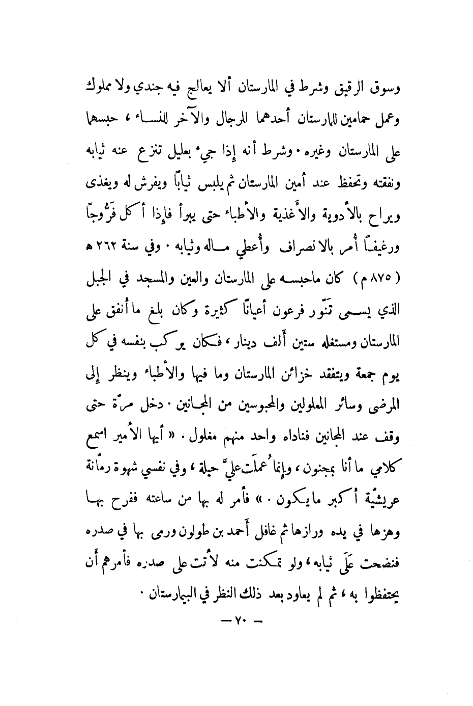 وسوق الرقيق وشرط في المارستان ألا يعالج فيه جندي ولا مملوك وعمل حمامين للمارستان أحدهما للرجال والآخر للنساء، حبسهما على المارستان وغيره. وشرط أنه إذا جيء بعليل تنزع عنه ثيابه ونفقته وتحفظ عند أمين المارستان ثم يلبس ثيابا ويفرش له ويغذي ويراح بالأدوية والأغذية والأطباء حتى يبرأ فإذا أكل فرُّوجا ورغيفا أمر بالانصراف وأعطي ماله وثيابه. وفي سنة 262هـ 875م كان ما حبسه على المارستان والعين والمسجد في الجبل الذي يسمى