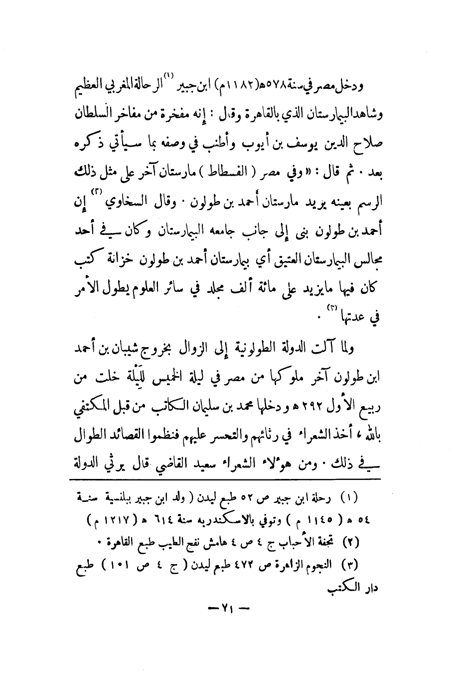 ودخل مصر في سنة 578هـ 1182م ابن جبير الرحالة المغربي العظيم وشاهد البيمارستان الذي بالقاهرة وقال: إنه مفخرة من مفاخر السلطان صلاح الدين يوسف بن أيوب وأطنب في وصفه بما سيأتي ذكره بعد. ثم قال: وفي مصر الفسطاط مارستان آخر على مثل ذلك الرسم بعينه يريد مارستان أحمد بن طولون. وقال السخاوي إن أحمد بن طولون بنى إلى جانب جامعة البيمارستان وكان في أحد مجالس البيمارستان العتيق أي بيمارستان أحمد بن طولون خزانة كتب كان فيها ما يزيد على مائة ألف مجلد في سائر العلوم يطول الأمر في عدتها.