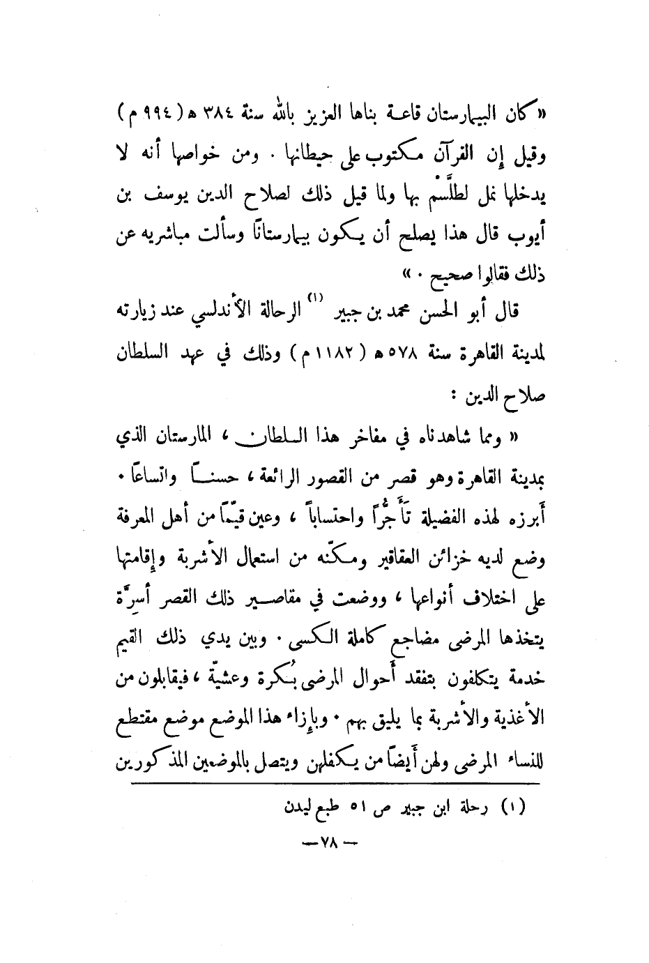 ومما شاهدناه في مفاخر هذا السلطان، المارستان الذي بمدينة القاهرة وهو قصر من القصور الرائعة، حسنا واتساعا. أبرزه لهذه الفضيلة تأجرا واحتسابا، وعين قيما من أهل المعرفة وضع لديه خزائن العقاقير ومكنه من استعمال الأشربة وإقامتها على اختلاف أنواعها، ووضعت في مقاضير ذلك القصر أسرة يتخذها المرضى مضاجع كاملة الكسى. وبين يدي ذلك القيم خدمة يتكلفون بتفقد أحوال المرضى بكرة وعشية، فيقابلون من الأغذية والأشربة بما يليق بهم. وبإزاء هذا الموضع موضع مقتطع للنساء المرضى ولهن أيضا من يكلفهن ويتصل بالموضعين المذكورين