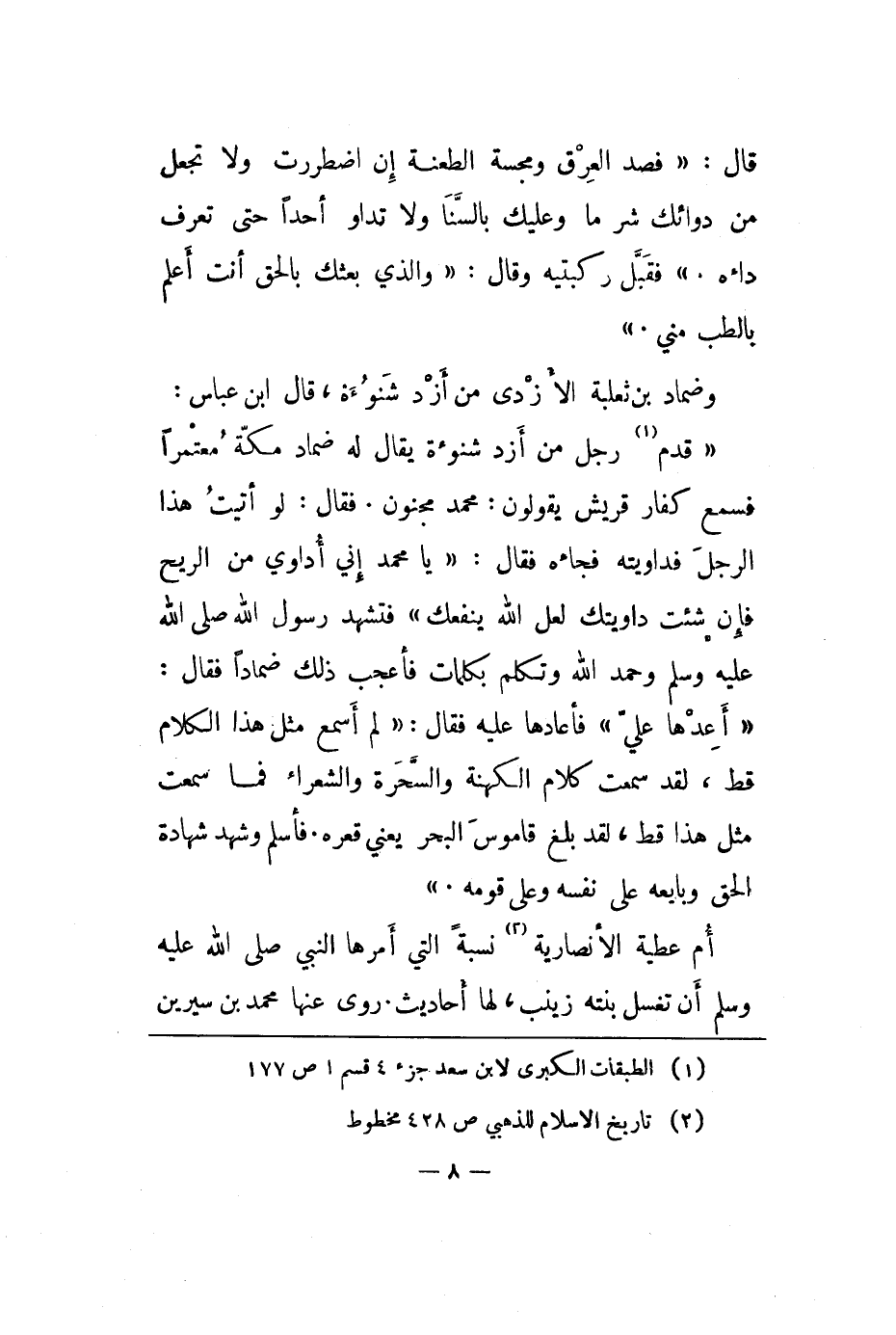 قدم رجل من أزد شنوة يقال له ضماد مكة معتمرا فسمع كفار قريش يقولون: محمد مجنون. فقال: لو أتيت هذا الرجل فداويته فجاءه فقال: يا محمد إني أداوي من الريح فإن شئت داويتك لعل الله ينفعك فتشهد رسول الله صلى الله عليه وسلم وحمد الله وتكلم بكلمات فأعجب ذلك ضمادا فقال: أعدها عليّ فأعادها عليه فقال: لم أسمع مثل هذا الكلام قط، لقد سمعت كلام الكهنة والسحرة والشعراء فما سمعت مثل هذا قط، لقد بلغ قاموس البحر يعني قعره. فأسلم وشهد شهادة الحق وبايعه على نفسه وعلى قومه.