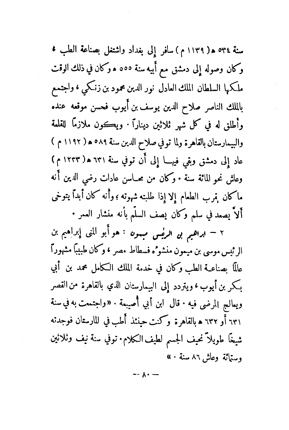 2 - إبراهيم بن الرئيس ميمون: هو أبو المنى إبراهيم بن الرئيس موسى بن ميمون منشؤه فسطاط مصر، وكان طبيبا مشهورا عالما بصناعة الطب وكان في خدمة الملك الكامل محمد بن أبي بكر بن أيوب، ويتردد إلى البيمارستان الذي بالقاهرة من القصر ويعالج المرضى فيه. قال ابن أبي أصيبعة. واجتمعت به في سنة 631 أو 632هـ بالقاهرة وكنت حينئذ أطب في المارستان فوجدته شيخا طويلا نحيف الجشم لطيف الكلام. توفي سنة نيف وثلاثين وستمائة وعاش 86سنة.