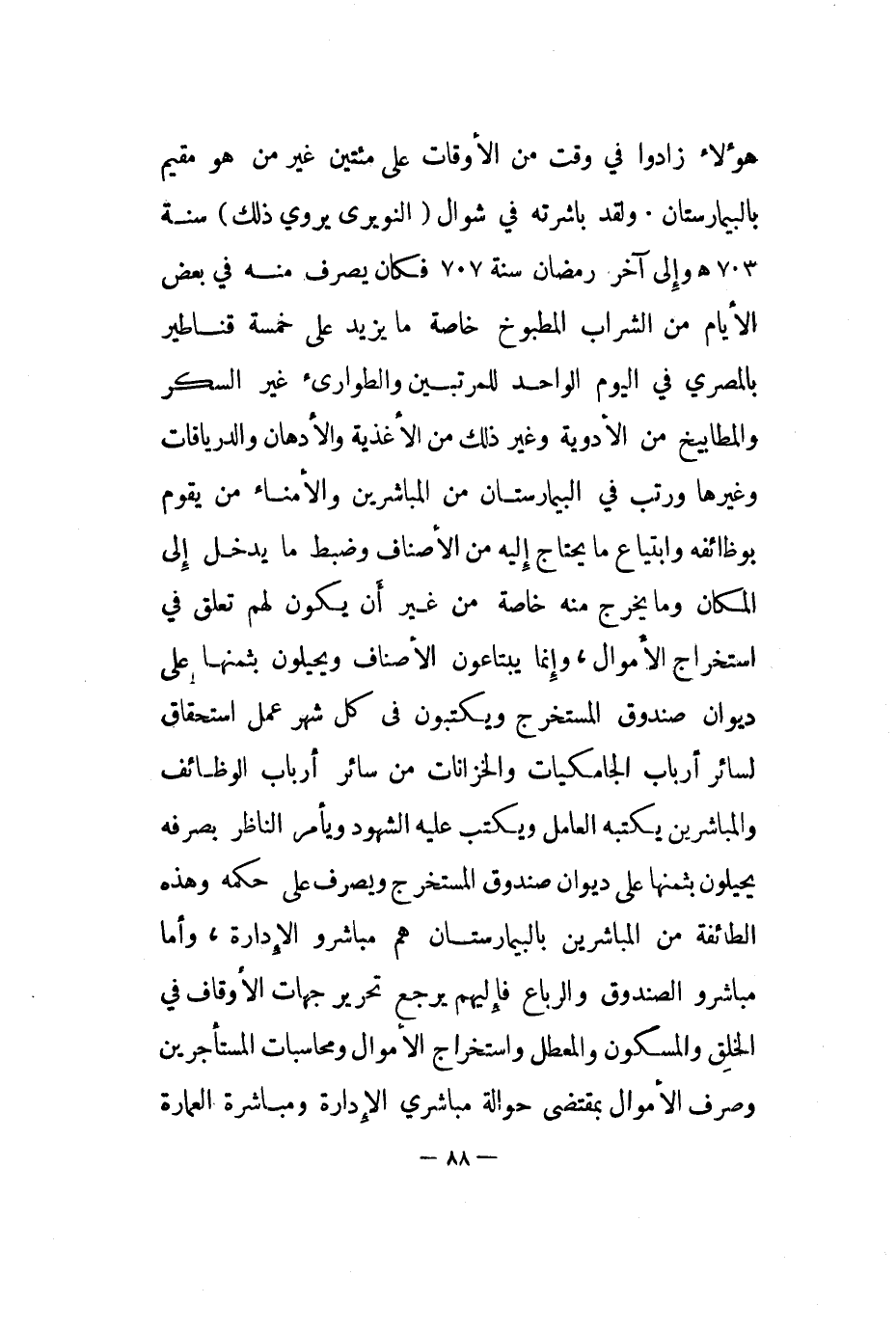 هؤلاء زادوا في وقت من الأوقات على مائتين غير من هو مقيم بالبيمارستان. ولقد باشرته في شوال النويري يروي ذلك سنة 703هـ وإلى آخر رمضان سنة 707 فكان يصرف منه في بعض الأيام من الشراب والمطبوخ خاصة ما يزيد على خمسة قناطير بالمصري في اليوم الواحد للمرتبين والطوارئ غير السكر والمطابيخ من الأدوية وغير ذلك من الأغذية والأدهان والدرياقات وغيرها ورتب في البيمارستان من المباشرين والأمناء من يقوم بوظائفه وابتياع ما يحتاج إليه من الأصناف وضبط ما يدخل إلى المكان وما يخرج منه خاصة من غير أن يكون لهم تعلق في استخراج الأموال، وإنما يبتاعون الأصناف ويحيلون بثمنها على ديوان صندوق المستخرج ويكتبون في كل شهر عمل استحقاق لسائر أرباب الجامكيات والخزانات من سائر أرباب الوظائف والمباشرين يكتبه العامل ويكتب عليه الشهود ويأمر الناظر بصرفه يحيلون بثمنها على ديوان صندوق المستخرج ويصرف على حكمه وهذه الطائفة من المباشرين بالبيمارستان هم مباشرو الإدارة، وأما مباشرو الصندوق والرباع فإليهم يرجع تحرير جهات الأوقاف في الخلق والمسكون والمعطل واستخراج الأموال ومحاسبات المستأجرين وصرف الأموال بمقتضى حوالة مباشري الإدارة ومباشرة العمارة