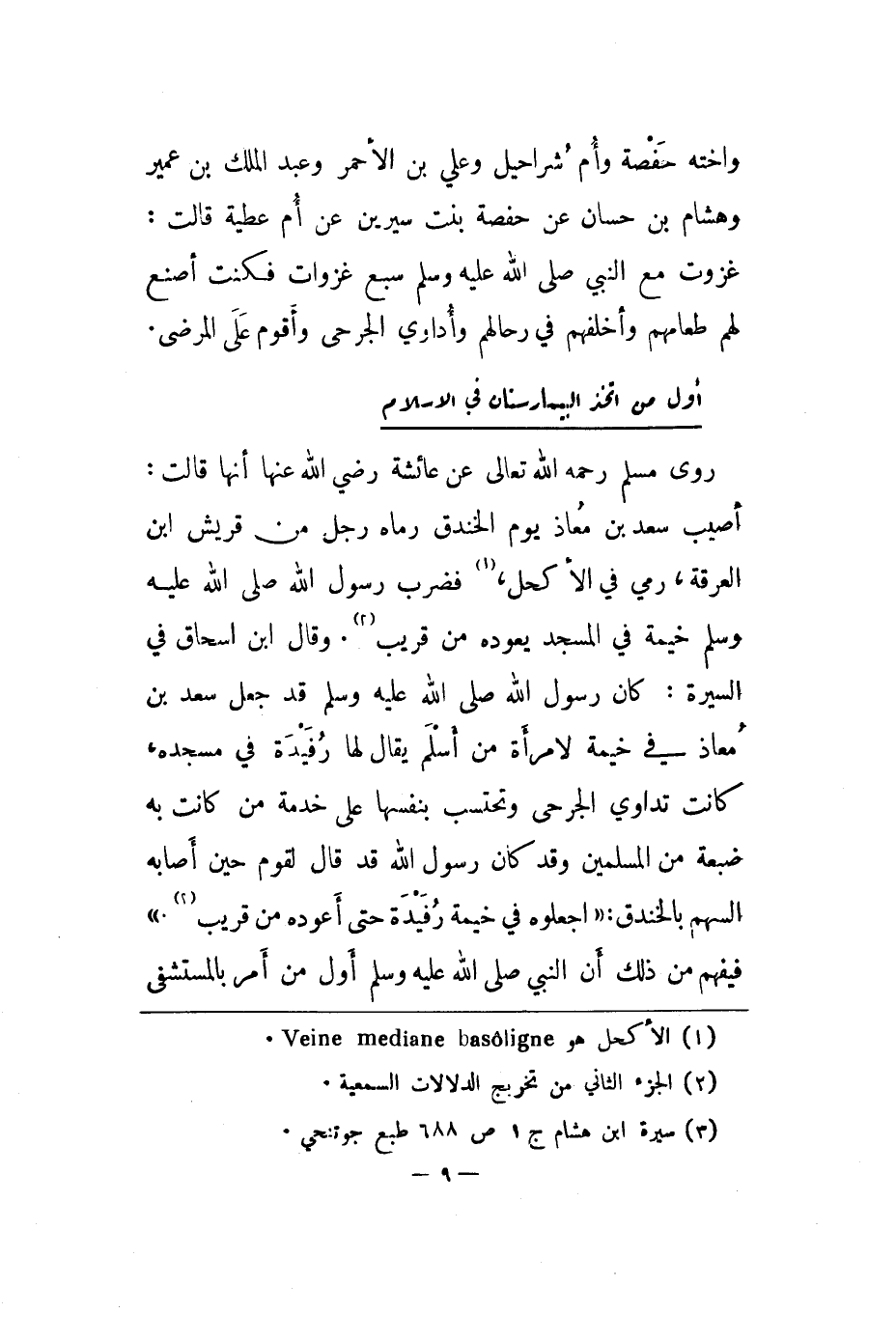 معاذ يوم الخندق رماه رجل من قريش أبن العرفة، رمي في الأكحل، فضرب رسول الله صلى الله عليه وسلم خيمة في المسجد يعوده من قريب. وقال ابن إسحاق في السيرة: كان رسول الله صلى الله عليه وسلم قد جعل سعد بن معاذ في خيمة لامرأة من أسلم يقال لها رُفيدة في مسجده، كانت تداوي الجرحى وتحتسب بنفسها على خدمة من كانت به ضبعة من المسلمين وقد كان رسول الله قد قال لقوم حين أصابه السهم بالخندق: اجعلوه في خيمة رُفيدة حتى أعوده من قريب. فيفهم من ذلك أن النبي صلى الله عليه وسلم أول من أمر بالمستشفى
