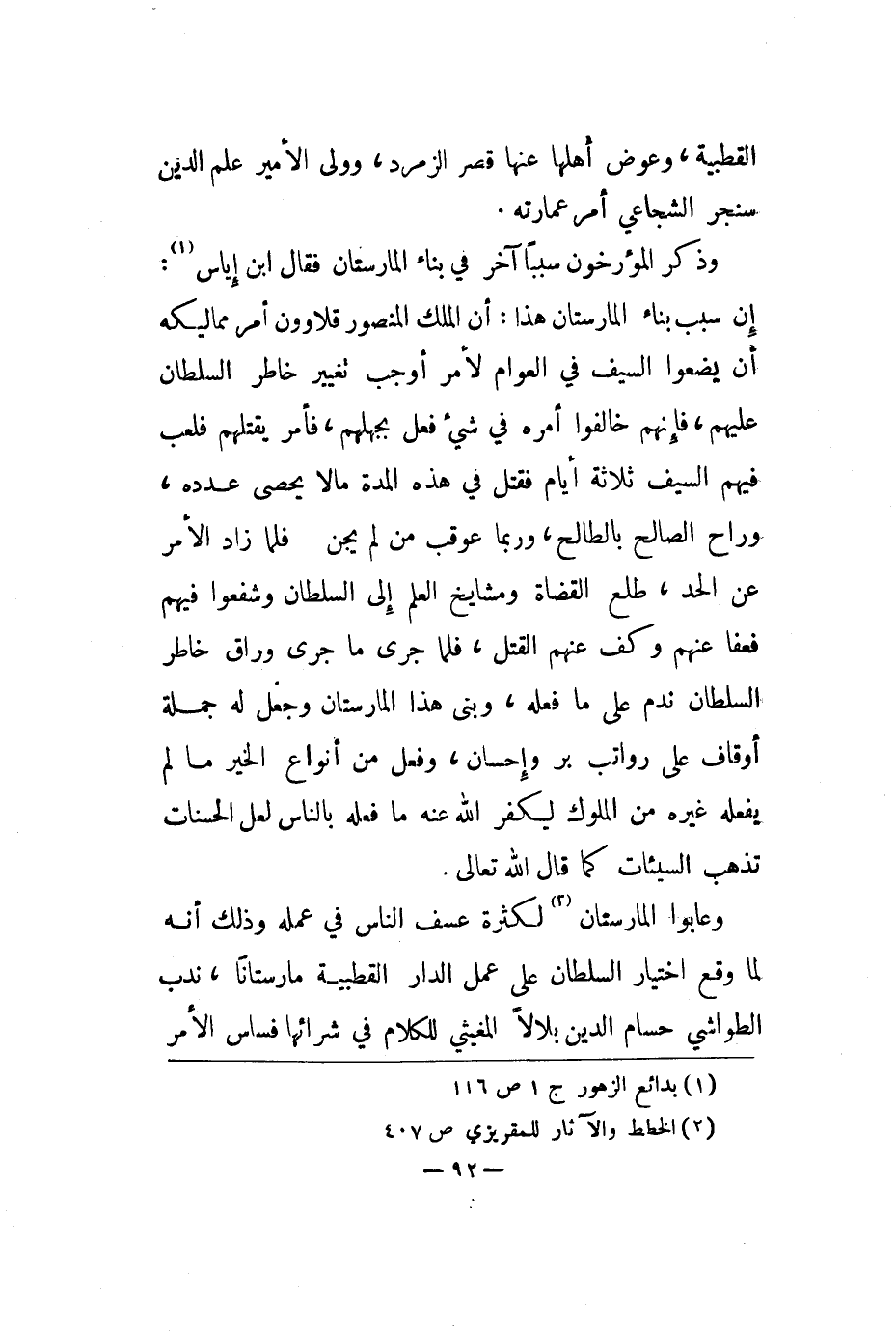 وعابوا المارستان لكثرة عسف الناس في عمله وذلك أنه لما وقع اختيار السلطان على عمل الدار القطبية مارستانا، ندب الطواشي حسام الدين بلالا المغيثي للكلام في شرائها فساس الأمر