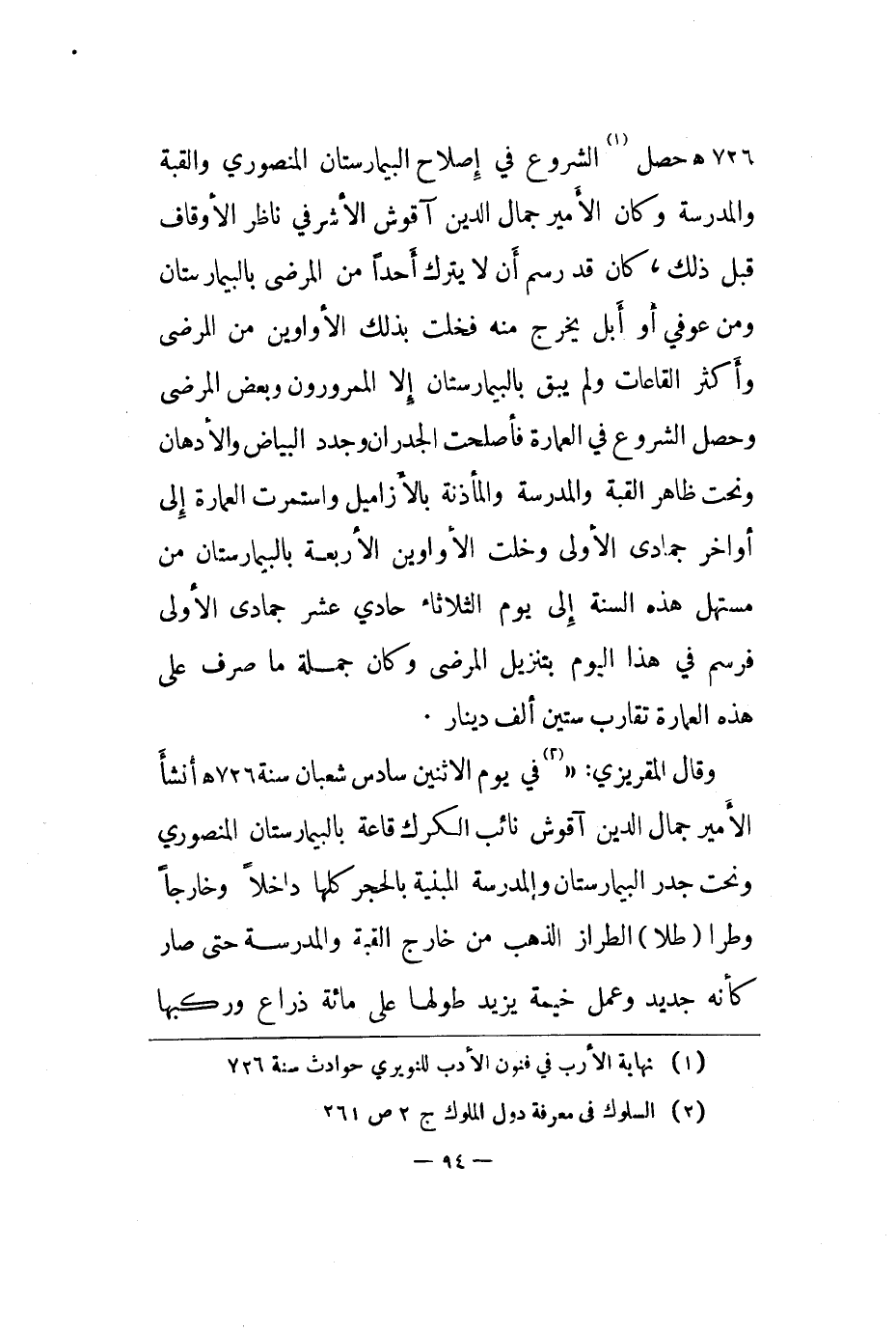 المرضى وأكثر القاعات ولم يبق بالبيمارستان إلا الممرورون وبعض المرضى وحصل الشروع في العمارة فأصلحت الجدران وجدد البياض والأدهان ونحت ظاهر القبة والمدرسة والمئذنة بالأزاميل واستمرت العمارة إلى أواخر جمادى الأولى وخلت الأواوين الأربعة بالبيمارستان من مستهل هذه السنة إلى يوم الثلاثاء حادي عشر جمادى الأولى فرسم في هذا اليوم بتنزيل المرضى وكان جملة ما صرف على هذه العمارة تقارب ستين ألف دينار.