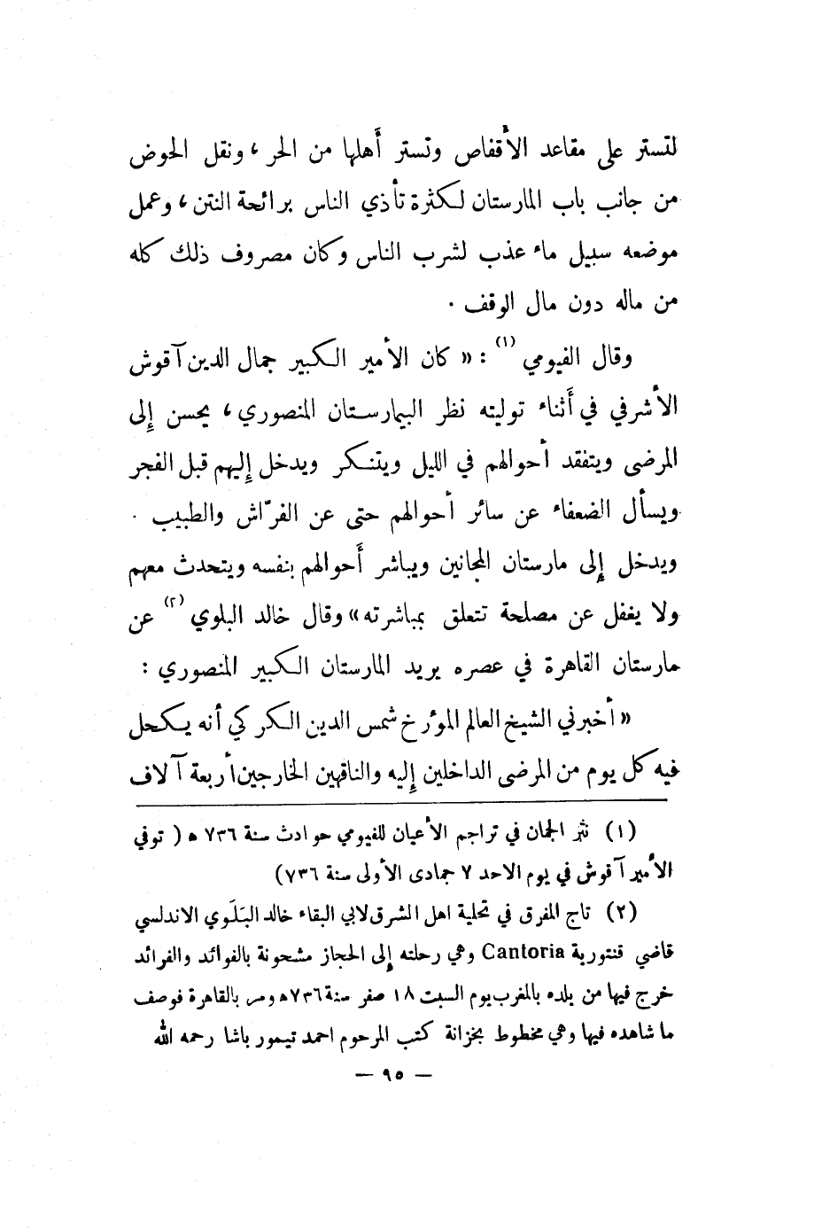 وقال الفيومي: كان الأمير الكبير جمال الدين آقوش الأشرفي في أثناء توليته نظر البيمارستان المنصوري، يحسن إلى المرضى ويتفقد أحوالهم في الليل ويتنكر ويدخل إليهم قبل الفجر ويسأل الضعفاء عن سائر أحوالهم حتى عن الفراش والطبيب. ويدخل إلى مارستان المجانين ويباشر أحوالهم بنفسه ويتحدث معهم ولا يغفل عن مصلحة تتعلق بمباشرته وقال خالد البلوي عن مارستان القاهرة في عصره يريد المارستان الكبير المنصوري: