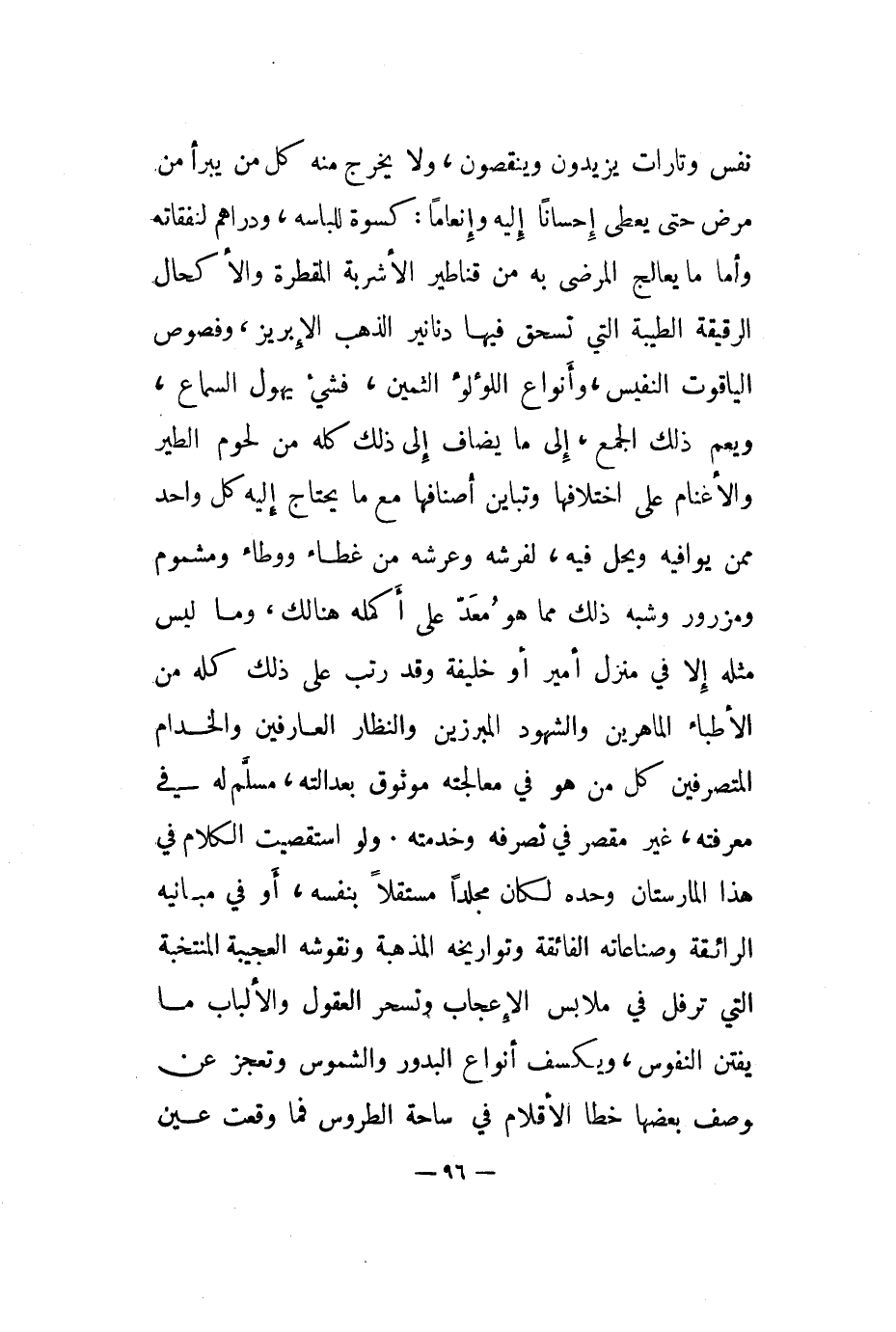 كسوة للباسه، ودراهم لنفقاته وأما ما يعالج المرضى به من قناطير الأشربة المقطرة والأكحال الرقيقة الطيبة التي تسحق فيها دنانير الذهب الإبريز، وفصوص الياقوت النفيس، وأنواع اللؤلؤ الثمين، فشيء يهول السماع، ويعم ذلك الجمع، إلى ما يضاف إلى ذلك كله من لحوم الطير والأغنام على اختلافها وتباين أصنافها مع ما يحتاج إليه كل واحد ممن يوافيه ويحل فيه، لفرشه وعرشه من غطاء ووطاء ومشموم ومزرور وشبه ذلك مما هو معد على أكمله هنالك، وما ليس مثله إلا في منزل أمير أو خليفة وقد رتب على ذلك كله من الأطباء الماهرين والشهود المبرزين والنظار العارفين والخدام المتصرفين كل من هو في معالجته موثوق بعدالته، مسلم له في معرفته، غير مقصر في تصرفه وخدمته. ولو استقصيت الكلام في هذا المارستان وحده لكان مجلدا مستقلا بنفسه، أو في مبانيه الرائقة وصناعاته الفائقة وتواريخه المذهبة ونقوشه العجيبة المنتخبة التي ترفل في ملابس الإعجاب وتسحر العقول والألباب ما يفتن النفوس، ويكسف أنواع البدور والشموس وتعجز عن وصف بعضها خطأ الأقلام في ساحة الطروس فما وقعت عين