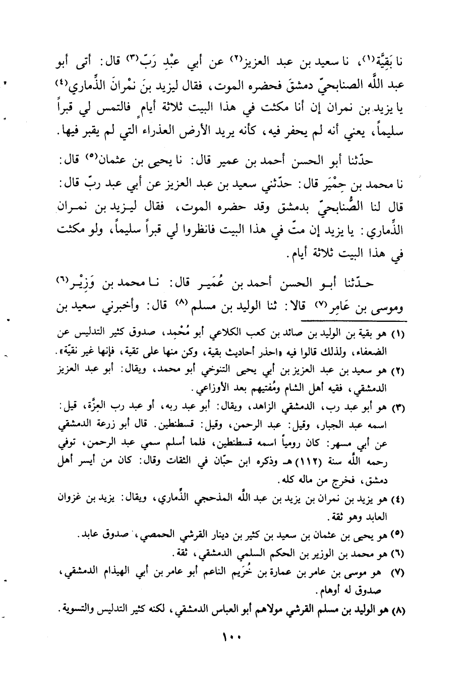 حَدَّثَنَا أَبُوالْحَسَنِ أَحْمَدُ بْنُ عُمَيْرٍ قَالَ: نا مُحَمَّدُ بْنُ وَزِيرٍ، وَمُوسَى بْنُ عَامِرٍ قَالَا: ثَنَا الْوَلِيدُ بْنُ مُسْلِمٍ قَالَ: وَأَخْبَرَنِي سَعِيدُ بْنُ -[101]- عَبْدِ الْعَزِيزِ، عَنْ يَزِيدَ بْنِ نِمْرَانَ، أَنَّ الصُّنَابِحِيّ قَالَ لَهُ: «يَا يَزِيدُ بْنَ نِمْرَانَ , §إِنْ مَكَثْتُ فِي هَذَا الْبَيْتِ ثَلَاثَةَ أَيَّامٍ , فَلَا تُخْرِجْنِي حَتَّى تُصِيبَ لِي قَبْرًا سَلِيمًا»
