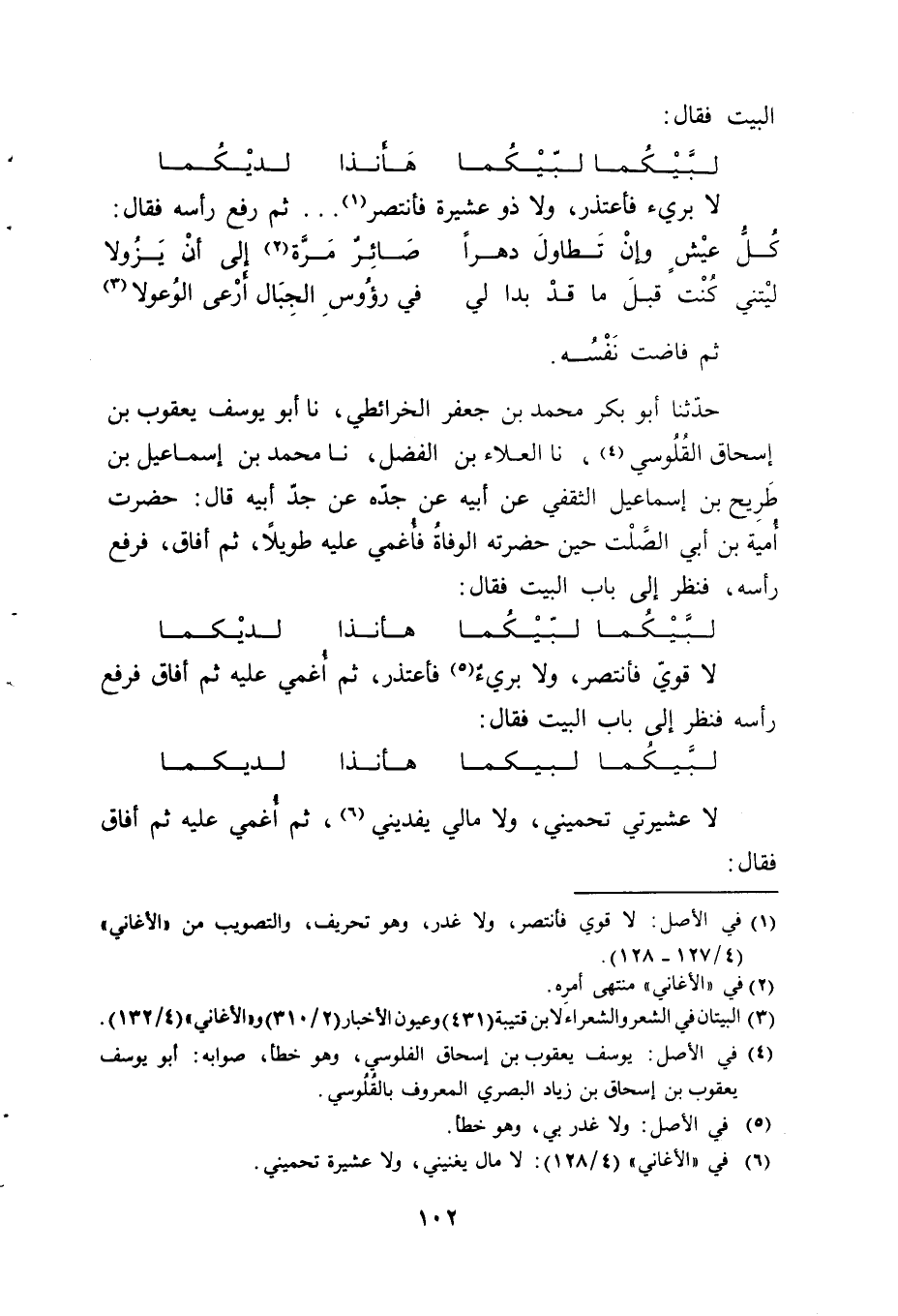 حَدَّثَنَا أَبُو بَكْرٍ مُحَمَّدُ بْنُ جَعْفَرٍ الْخَرَائِطِيُّ , نا أَبُو يُوسُفَ يَعْقُوبُ بْنُ إِسْحَاقَ الْقُلُوسِيُّ , نا الْعَلَاءُ بْنُ الْفَضْلِ , نا مُحَمَّدُ بْنُ إِسْمَاعِيلَ بْنِ طَرِيحِ بْنِ إِسْمَاعِيلَ الثَّقَفِيُّ , عنْ أَبِيهِ , عنْ جَدِّهِ , عنْ جَدِّ أَبِيهِ قَالَ: حَضَرْتُ أُمَيَّةَ بْنَ أَبِي الصَّلْتِ حِينَ حَضَرَتْهُ الْوَفَاةُ فَأُغْمِيَ عَلَيْهِ طَوِيلًا , ثُمَّ أَفَاقَ , فَرَفَعَ رَأْسَهُ , فَنَظَرَ إِلَى بَابِ الْبَيْتِ فَقَالَ