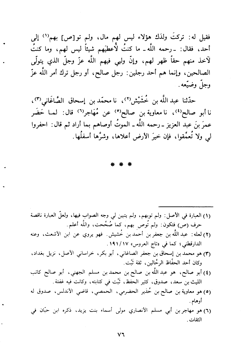 حَدَّثَنَا عَبْدُ اللَّهِ بْنُ خُشَيْشٍ، نا مُحَمَّدُ بْنُ إِسْحَاقَ الصَّاغَانِيُّ، نا أَبُو صَالِحٍ، نا مُعَاوِيَةُ بْنُ صَالِحٍ، عَنْ مُهَاجِرٍ قَالَ: لَمَّا حَضَرَ عُمَرَ بْنَ عَبْدِ الْعَزِيزِ رَحِمَهُ اللَّهُ الْمَوْتُ أَوْصَاهُمْ بِمَا أَرَادَ ثُمَّ قَالَ: §«احْفِرُوا لِي , وَلَا تُعَمِّقُوا , فَإِنَّ خَيْرَ الْأَرْضِ أَعْلَاهَا , وَشَرَّهَا أَسْفَلُهَا»