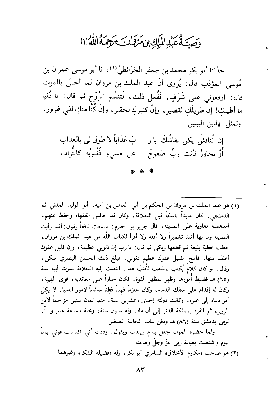حَدَّثَنَا أَبُو بَكْرٍ مُحَمَّدُ بْنُ جَعْفَرٍ الْخَرَائِطِيُّ , نا أَبُو مُوسَى عِمْرَانُ بْنُ مُوسَى الْمُؤَدِّبُ قَالَ: يُرْوَى أَنَّ عَبْدَ الْمَلِكِ بْنَ مَرْوَانَ لَمَّا أَحَسَّ بِالْمَوْتِ قَالَ: §" ارْفَعُونِي عَلَى شَرَفٍ , فَفُعِلَ ذَلِكَ , فَتَنَسَّمَ الرَّوْحَ ثُمَّ قَالَ: يَا دُنْيَا مَا أَطْيَبَكِ إِنَّ طَوِيلَكِ لَقَصِيرٌ , وَإِنَّ كَثِيرَكِ لَحَقِيرٌ , وَإِنْ كُنَّا مِنْكِ لَفِي غُرُورٍ , وَتَمَثَّلَ بِهَذَيْنِ الْبَيْتَيْنِ: