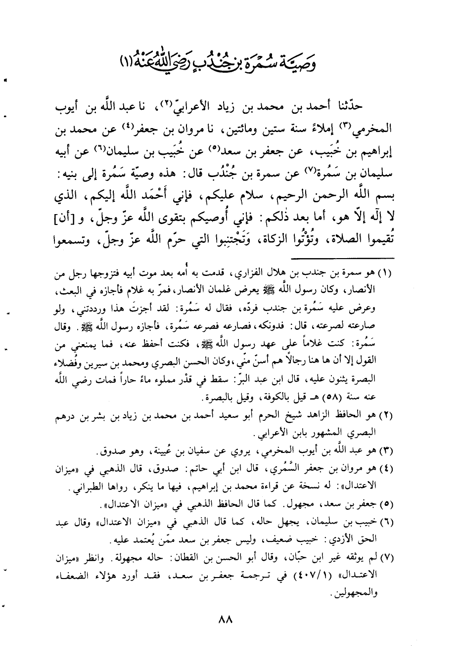 حَدَّثَنَا أَحْمَدُ بْنُ مُحَمَّدِ بْنِ زِيَادٍ الْأَعْرَابِيُّ، نا عَبْدُ اللَّهِ بْنُ أَيُّوبَ الْمُخَرِّمِيُّ إِمْلَاءً سَنَةَ سِتِّينَ وَمِائَتَيْنِ , نا مَرْوَانُ بْنُ جَعْفَرٍ، عَنْ مُحَمَّدِ بْنِ إِبْرَاهِيمَ بْنِ خُبَيْبٍ، عَنْ جَعْفَرِ بْنِ سَعْدٍ، عَنْ خُبَيْبِ بْنِ سُلَيْمَانَ، عَنْ أَبِيهِ سُلَيْمَانَ بْنِ سَمُرَةَ , عَنْ سَمُرَةَ بْنِ جُنْدُبٍ قَالَ: هَذِهِ وَصِيَّةٌ سَمُرَةَ إِلَى بَنِيهِ: " بِسْمِ اللَّهِ الرَّحْمَنِ الرَّحِيمِ سَلَامٌ عَلَيْكُمْ , فَإِنِّي أَحْمَدُ اللَّهَ إِلَيْكُمُ , الَّذِي لَا إِلَهَ إِلَّا هُوَ , أَمَّا بَعْدَ ذَلِكُمْ: فَإِنِّي §أُوصِيكُمْ بِتَقْوَى اللَّهِ عَزَّ وَجَلَّ , وَأَنْ تُقِيمُوا الصَّلَاةَ , وَتُؤْتُوا الزَّكَاةَ , وَتَجْتَنِبُوا الَّتِي حَرَّمَ اللَّهُ عَزَّ وَجَلَّ , وَتَسْمَعُوا -[89]- وَتُطِيعُوا لِلَّهِ عَزَّ وَجَلَّ وَرَسُولِهِ صَلَّى اللهُ عَلَيْهِ وَسَلَّمَ , وَكُتُبِهِ , وَالْخَلِيفَةِ الَّذِي يَقُومُ عَلَى أَمْرِ اللَّهِ عَزَّ وَجَلَّ , وَجَمِيعِ الْمُسْلِمِينَ. أَمَّا بَعْدُ: فَإِنَّ رَسُولَ اللَّهِ صَلَّى اللهُ عَلَيْهِ وَسَلَّمَ كَانَ يَأْمُرُنَا أَنْ يُصَلِّيَ أَحَدُنَا كُلَّ لَيْلَةٍ بَعْدَ الصَّلَاةِ الْمَكْتُوبَةِ مَا قَلَّ أَوْ كَثُرَ مِنَ الصَّلَاةِ , وَنَجْعَلَهَا وِتْرًا , وَكَانَ يَأْمُرُ أَنْ نُصَلِّيَ أَيَّ سَاعَةٍ شِئْنَا مِنَ اللَّيْلِ وَالنَّهَارِ , غَيْرَ أَنَّهُ أَمَرَنَا أَنْ نَجَتَنِبَ طُلُوعَ الشَّمْسِ وَغُرُوبَهَا وَقَالَ: إِنَّ الشَّيْطَانَ يَغِيبُ مَعَهَا حِينَ تَغِيبُ , وَيَطْلُعُ مَعَهَا حِينَ تَطْلُعُ. وَأَمَرَنَا أَنْ نُحَافِظَ عَلَى الصَّلَوَاتِ كُلِّهِنَّ , وَأَوْصَانَا بِالصَّلَاةِ الْوُسْطَى , وَنَبَّأَنَا أَنَّهَا صَلَاةُ الْعَصْرِ "