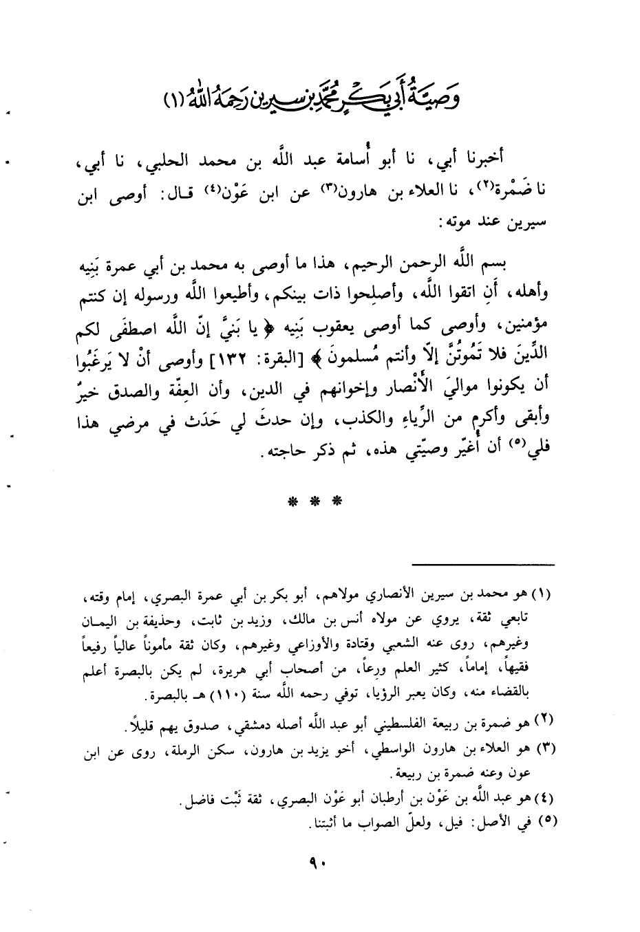 أَخْبَرَنَا أَبِي، نا أَبُو أُسَامَةَ عَبْدُ اللَّهِ بْنُ مُحَمَّدٍ الْحَلَبِيُّ، نا أَبِي، نا ضَمْرَةُ، نا الْعَلَاءُ بْنُ هَارُونَ، عَنِ ابْنِ عَوْنٍ قَالَ: أَوْصَى ابْنُ سِيرِينَ عِنْدَ مَوْتِهِ: بِسْمِ اللَّهِ الرَّحْمَنِ الرَّحِيمِ , هَذَا مَا أَوْصَى بِهِ مُحَمَّدُ بْنُ أَبِي عَمْرَةَ بَنِيهِ وَأَهْلَهُ , أَنِ §اتَّقُوا اللَّهَ , وَأَصْلِحُوا ذَاتَ بَيْنِكُمْ , وَأَطِيعُوا اللَّهَ وَرَسُولَهُ إِنْ كُنْتُمْ مُؤْمِنِينَ. وَأَوْصَى كَمَا أَوْصَى يَعْقُوبُ بَنِيهِ: {يَا بَنِيَّ إِنَّ اللَّهَ اصْطَفَى لَكُمُ الدِّينَ فَلَا تَمُوتُنَّ إِلَّا وَأَنْتُمْ مُسْلِمُونَ} [البقرة: 132] , وَأَوْصَى أَنْ يَرْغَبُوا أَنْ يَكُونُوا مَوَالِيَ الْأَنْصَارِ , وَإِخْوَانَهُمْ فِي الدِّينِ , وَأَنَّ الْعِفَّةَ وَالصِّدْقَ خَيْرٌ وَأَبْقَى وَأَكْرَمُ مِنَ الرِّيَاءِ وَالْكَذِبِ , وَإِنْ حَدَثَ لِي حَدَثٌ فِي مَرَضِي هَذَا , فَلِي أَنْ أُغَيِّرَ وَصِيَّتِي هَذِهِ , ثُمَّ ذَكَرَ حَاجَتَهُ "
