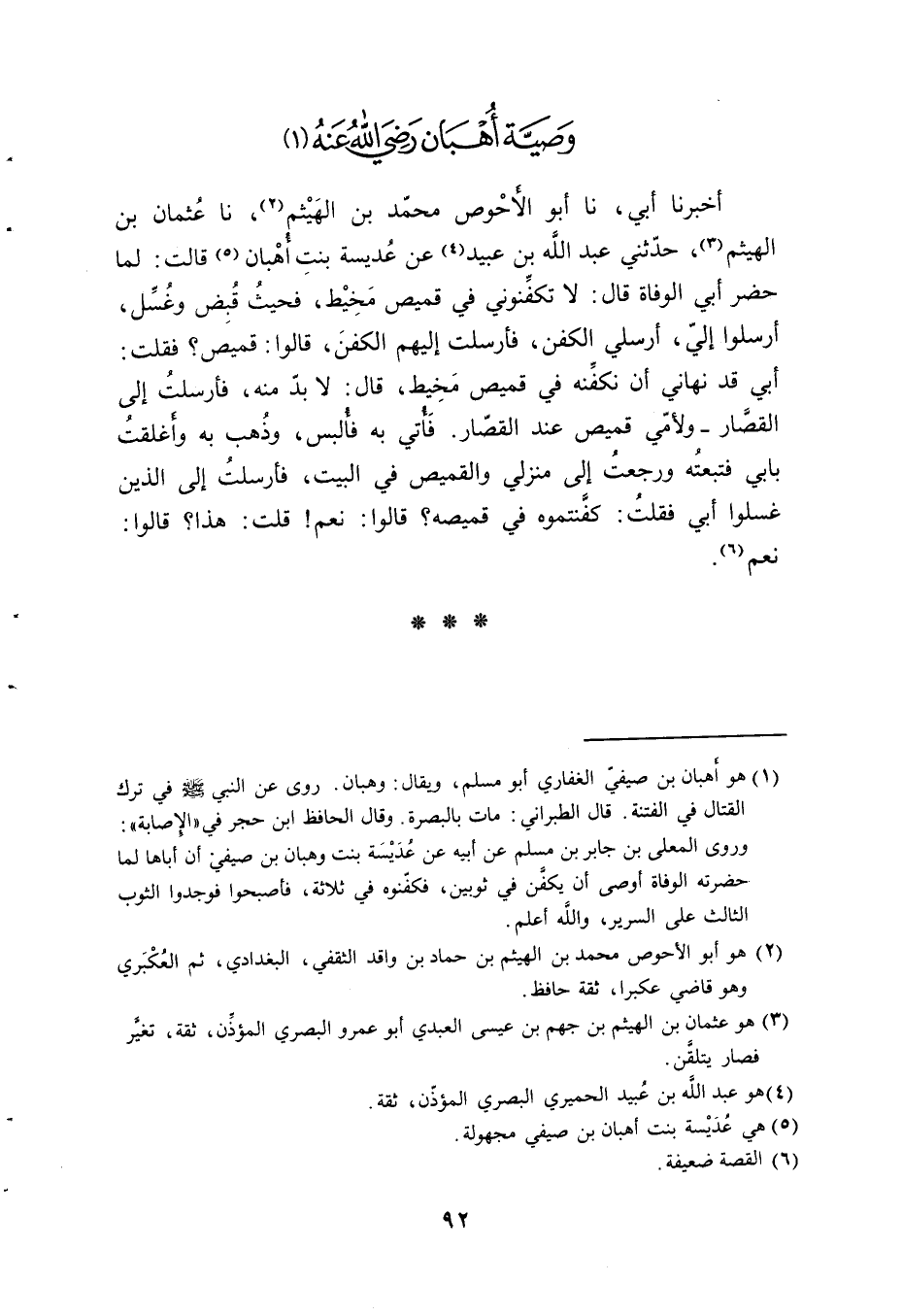 أَخْبَرَنَا أَبِي، نا أَبُو الْأَحْوَصِ مُحَمَّدُ بْنُ الْهَيْثَمِ , نا عُثْمَانُ بْنُ الْهَيْثَمِ، حَدَّثَنِي عَبْدُ اللَّهِ بْنُ عُبَيْدٍ، عَنْ عُدَيْسَةَ بِنْتِ أُهْبَانَ قَالَتْ: لَمَّا حَضَرَ أَبِي الْوَفَاةُ قَالَ: §" لَا تُكَفِّنُونِي فِي قَمِيصٍ مَخِيطٍ , فَحَيْثُ قُبِضَ وَغُسِّلَ , أَرْسَلُوا إِلَيَّ: أَرْسِلِي الْكَفَنَ , فَأَرْسَلْتُ إِلَيْهِمُ الْكَفَنَ , قَالُوا: قَمِيصٌ؟ فَقُلْتُ: أَبِي قَدْ نَهَانِي أَنْ نُكَفِّنَهُ فِي قَمِيصٍ مَخِيطٍ , قَالَ: لَا بُدَّ مِنْهُ , فَأَرْسَلْتُ إِلَى الْقَصَّارِ - وَلِأُمِّي قَمِيصٌ عِنْدَ الْقَصَّارِ - فَأُتِيَ بِهِ , فَأُلْبِسَ , وَذُهِبَ بِهِ , وَأَغْلَقْتُ بَابِيَ , فَتَبِعْتُهُ وَرَجَعْتُ إِلَى مَنْزِلِي , وَالْقَمِيصُ فِي الْبَيْتِ , فَأَرْسَلْتُ إِلَى الَّذِينَ غَسَّلُوا أَبِي فَقُلْتُ: كَفَّنْتُمُوهُ فِي قَمِيصَهِ؟ قَالُوا: نَعَمْ , قُلْتُ: هَذَا؟ قَالُوا: نَعَمْ "