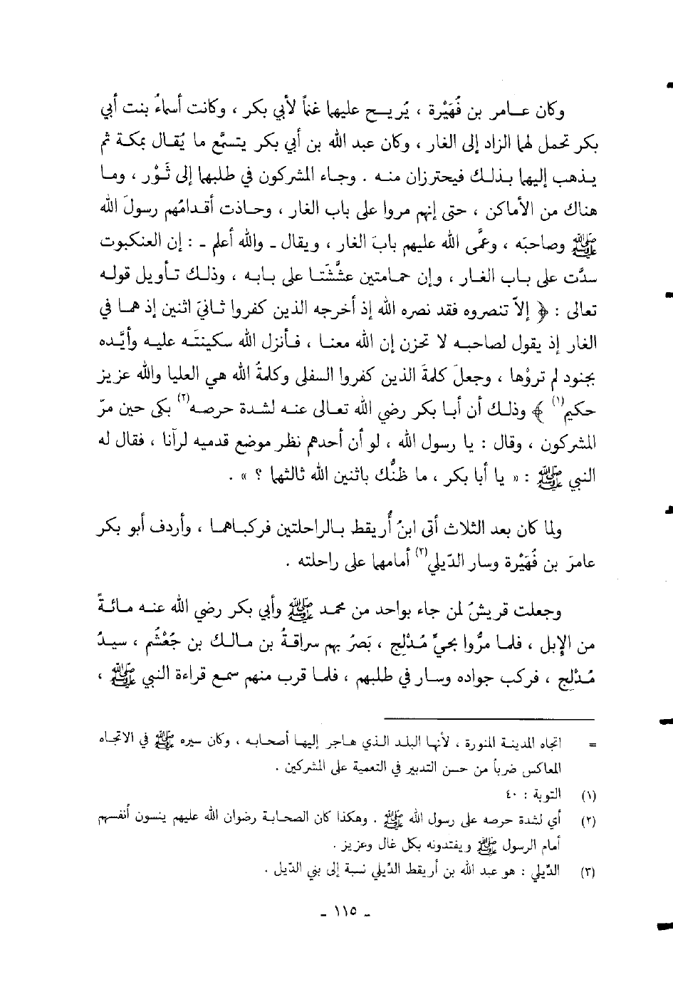 ولما كان بعد الثلاث أتى ابن أريقط بالراحلتين فركباهما، وأردف أبو بكر عامر بن فهيرة وسار الديلي أمامهما على راحلته.