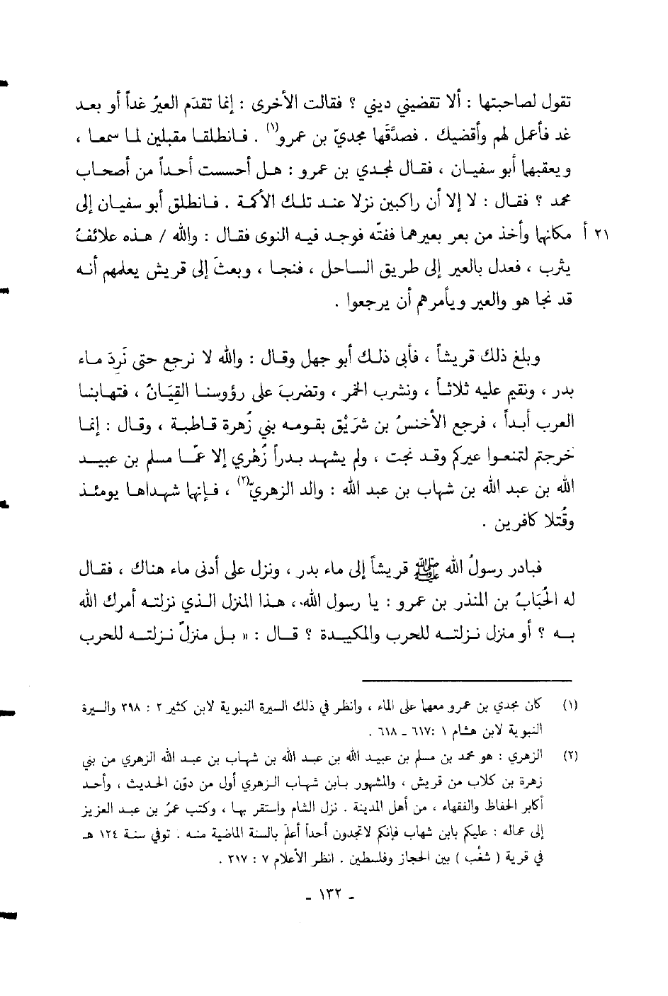 وبلغ ذلك قريشاً، فأبى أبو جهل وقال: والله لا نرجع حتى نرد ماء بدر، ونقيم عليه ثلاثاً، ونشرب الخمر، وتضرب على رؤوسنا القيان، فتهابنا العرب أبداً، فرجع الأخنس بن شريق بقومه بني زهرة قاطبة، وقال: إنما خرجتم لتمنعوا عيركم وقد نجت، ولم يشهد بدراً زهري إلا عما مسلم بن عبيد الله بن عبد الله بن شهاب بن عبد الله: والد الزهري، فإنهما شهداها يومئذ وقتلا كافرين.