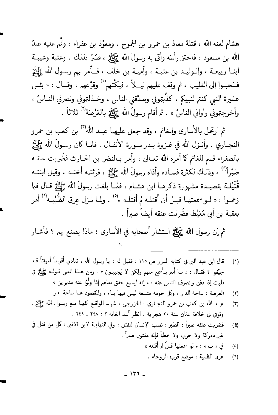 ولما نزل عرق الظبية أمر بعقبة بن أبي معيط فضربت عنقه أيضاً صبراً.