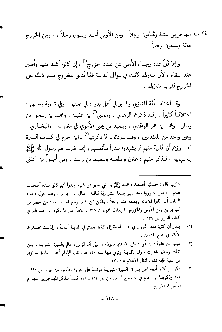 وقد اختلف أئمة المغازي والسير في أهل بدر: في عدتهم، وفي تسمية بعضهم، اختلافاً كثيراً، وقد ذكرهم الزهري، وموسى بن عقبة، ومحمد بن إسحق بن يسار، ومحمد بن عمر الواقدي، وسعيد بن يحيى الأموي في مغازيه، والبخاري، وغير واحد من المتقدمين، وقد سردهم ـ كما ذكرتهم ـ ابن حزم في كتاب السيرة له، وزعم أن ثمانية منهم لم يشهدوا بدراً بأنفسهم وإنما ضرب لهم رسول الله صلى الله عليه وسلم بأسهمهم، فذكر منهم: عثمان وطلحة وسعيد بن زيد.
