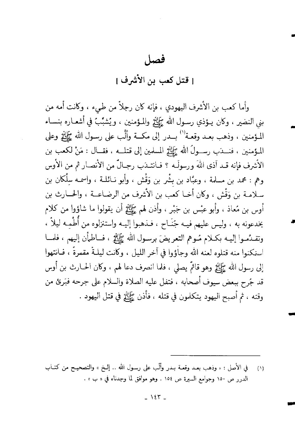 وأما كعب بن الأشرف اليهودي، فإنه كان رجلاً من طيء، وكانت أمه من بني النضير، وكان يؤذي رسول الله صلى الله عليه وسلم والمؤمنين، ويشبب في أشعاره بنساء المؤمنين، وذهب بعد وقعة بدر إلى مكة وألب على رسول الله صلى الله عليه وسلم وعلى المؤمنين، فندب رسول الله صلى الله عليه وسلم المسلمين إلى قتله، فقال: من لكعب بن الأشرف فإنه قد آذى الله ورسوله؟ فانتدب رجال من الأنصار ثم من الأوس وهم محمد بن مسلمة، وعباد بن بشر بن وقش، وأبو نائلة، واسمه سلكان بن سلامة بن وقش، وكان أخا كعب بن الأشرف من الرضاعة، والحارث بن أوس بن معاذ، وأبو عبس بن جبر، وأذن لهم صلى الله عليه وسلم أن يقولوا ما شاؤوا من كلام يخدعونه به، وليس عليهم فيه جناح، فذهبوا إليه واستنزلوه من أطمه ليلاً، وتقدموا إليه بكلام موهم التعريض برسول الله صلى الله عليه وسلم، فاطمأن إليهم، فلما استمكنوا منه قتلوه لعنه الله وجاؤوا في آخر الليل، وكانت ليلة مقمرة، فانتهوا إلى رسول الله صلى الله عليه وسلم وهو قائم يصلي، فلما انصرف دعا لهم، وكان الحارث بن أوس قد جرح ببعض سيوف أصحابه، فتفل عليه الصلاة والسلام على جرحه فبرئ من وقته، ثم أصبح اليهود يتكلمون في قتله، فأذن صلى الله عليه وسلم في قتل اليهود.