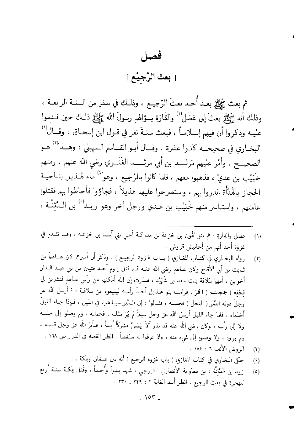 ومنهم خبيب بن عدي، فذهبوا معهم، فلما كانوا بالرجيع، وهو ماء لهذيل بناحية الحجاز بالهدأة غدروا بهم، واستصرخوا عليهم هزيلاً، فجاؤوا فأحاطوا بهم فقتلوا عامتهم، واستأسر منهم خبيب بن عدي ورجل آخر وهو زيد بن الدثنة