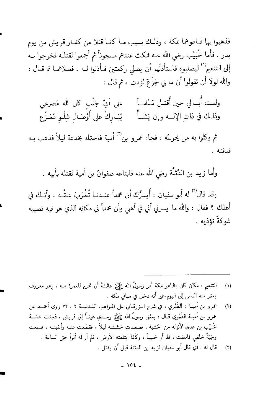 وقد قال له أبو سفيان: أيسرك أن محمداً عندنا تضرب عنقه، وأنك في أهلك؟ فقال: والله ما يسرني أني في أهلي وأن محمداً في مكانه الذي هو فيه تصيبه شوكة تؤذيه.