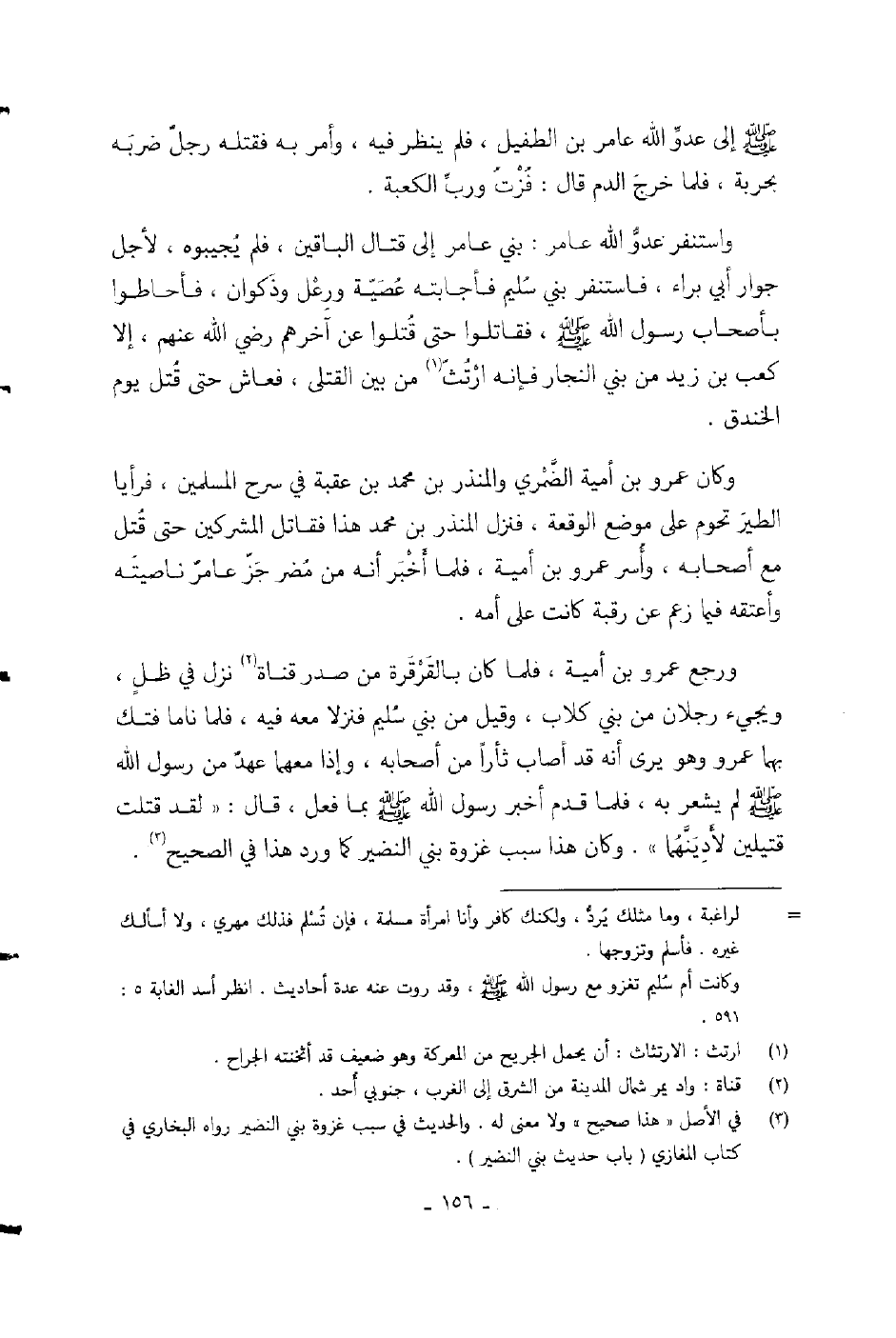 ورجع عمرو بن أمية، فلما كان بالقرقرة من صدر قناة نزل في ظل، ويجيء رجلان من بني كلاب، وقيل من بني سليم فنزلا معه فيه، فلما ناما فتك بهما عمرو وهو يرى أنه قد أصاب ثأراً من أصحابه، وإذا معهما عهد من رسول الله صلى الله عليه وسلم لم يشعر به، فلما قدم أخبر رسول الله صلى الله عليه وسلم بما فعل، قال: [لقد قتلت قتيلين لأدينهما] .