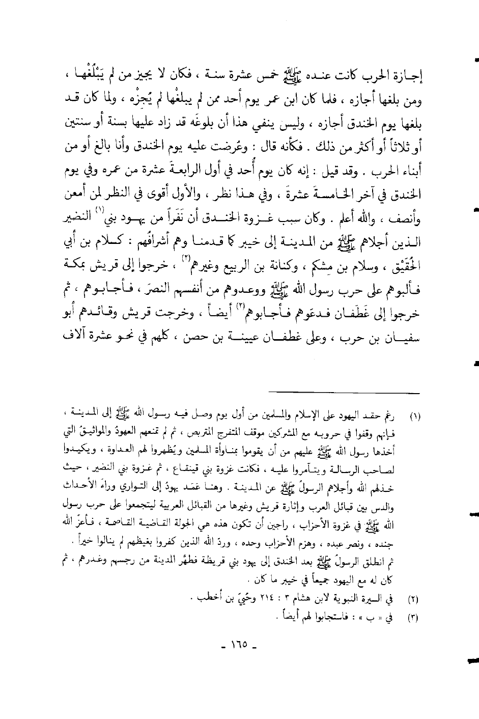 إجازة الحرب كانت عنده صلى الله عليه وسلم خمس عشرة سنة، فكان لا يجيز من لم يبلغها، ومن بلغها أجازه، فلما كان ابن عمر يوم أحد ممن لم يبلغها لم يجزه، ولما كان قد بلغها يوم الخندق أجازه، وليس ينفي هذا أن بلوغه قد زاد عليها بسنة أو بسنتين أو ثلاثاً أو أكثر من ذلك.