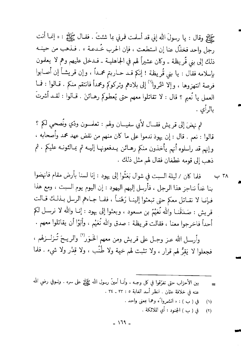 فذهب من حينه ذلك إلى بني قريظة ـ وكان عشيراً لهم في الجاهلية ـ فدخل عليهم وهم لا يعلمون بإسلامه فقال يا بني قريظة! إنكم قد حاربتم محمداً، وإن قريشاً إن أصابوا فرصة انتهزوها، وإلا شمروا إلى بلادهم وتركوكم ومحمداً فانتقم منكم.