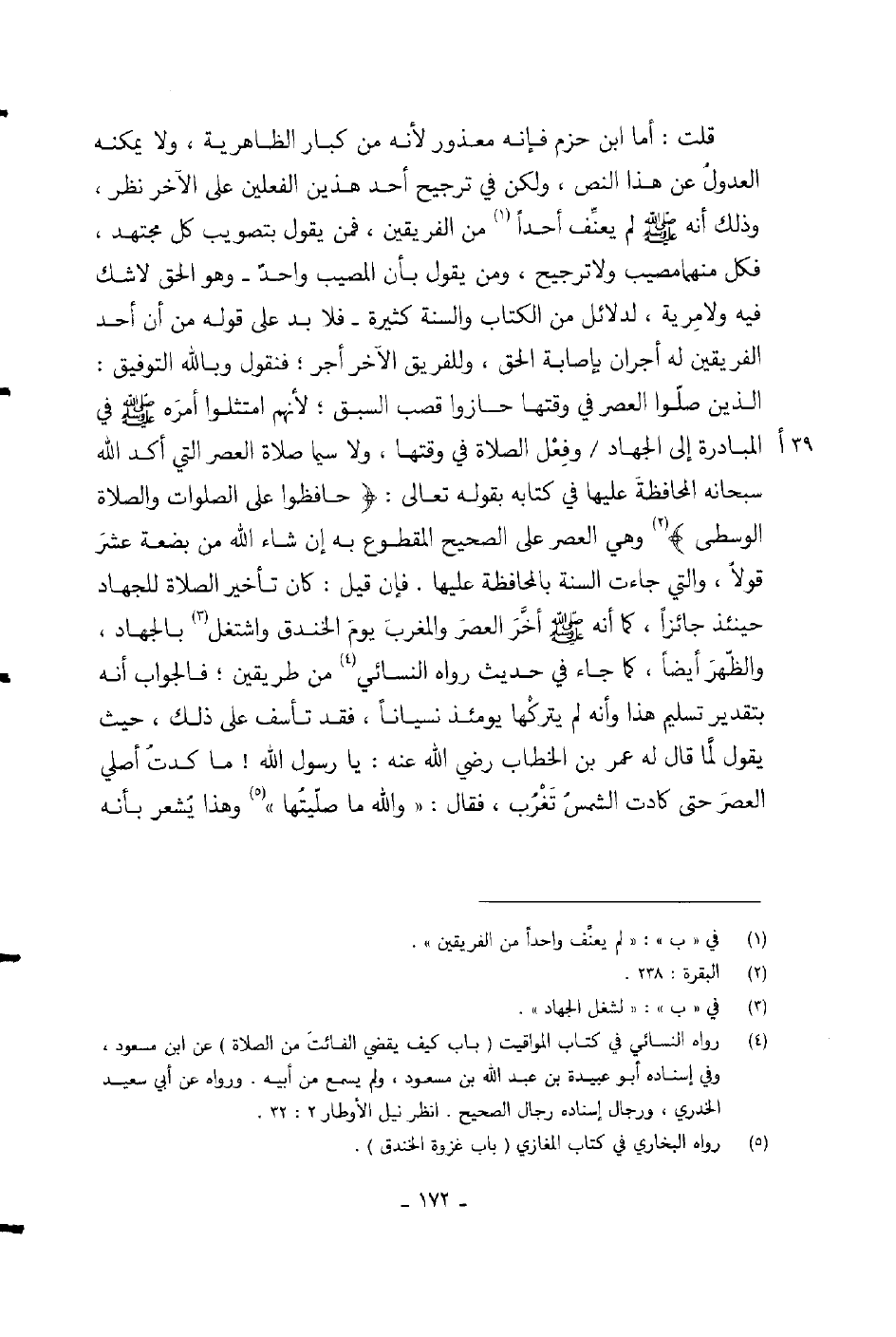 قلت أما ابن حزم فإنه معذور لأنه من كبار الظاهرية، ولا يمكنه العدول عن هذا النص، ولكن في ترجيح أحد هذين الفعلين على الآخر نظر وذلك أنه صلى الله عليه وسلم لم يعنف أحداً من الفريقين، فمن يقول بتصويب كل مجتهد، فكل منهما مصيب ولا ترجيح، ومن يقول بأن المصيب واحد ـ وهو الحق لاشك فيه ولامرية، لدلائل من الكتاب والسنة كثيرة ـ فلا بد على قوله من أن أحد الفريقين له أجران بإصابة الحق، وللفريق الآخر أجر، فنقول وبالله التوفيق: الذين صلوا العصر في وقتها حازوا قصب السبق، لأنهم امتثلوا أمره صلى الله عليه وسلم في المبادرة إلى الجهاد وفعل الصلاة في وقتها، ولا سيما صلاة العصر التي أكد الله سبحانه المحافظة عليها في كتابه بقوله تعالى: {حافظوا على الصلوات والصلاة الوسطى} وهي العصر على الصحيح المقطوع به إن شاء الله من بضعة عشر قولاً، والتي جاءت السنة بالمحافظة عليها.