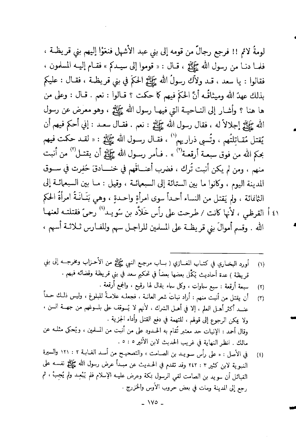 لومة لائم! ! فرجع رجال من قومه إلى بني عبد الأشهل فنعوا إليهم بني قريظة، فلما دنا من رسول الله صلى الله عليه وسلم، قال: «قوموا إلى سيدكم» فقام إليه المسلمون، فقالوا: يا سعد، قد ولاك رسول الله صلى الله عليه وسلم الحكم في بني قريظة، فقال: عليكم بذلك عهد الله وميثاقه أن الحكم فيهم كما حكمت؟ قالوا: نعم.