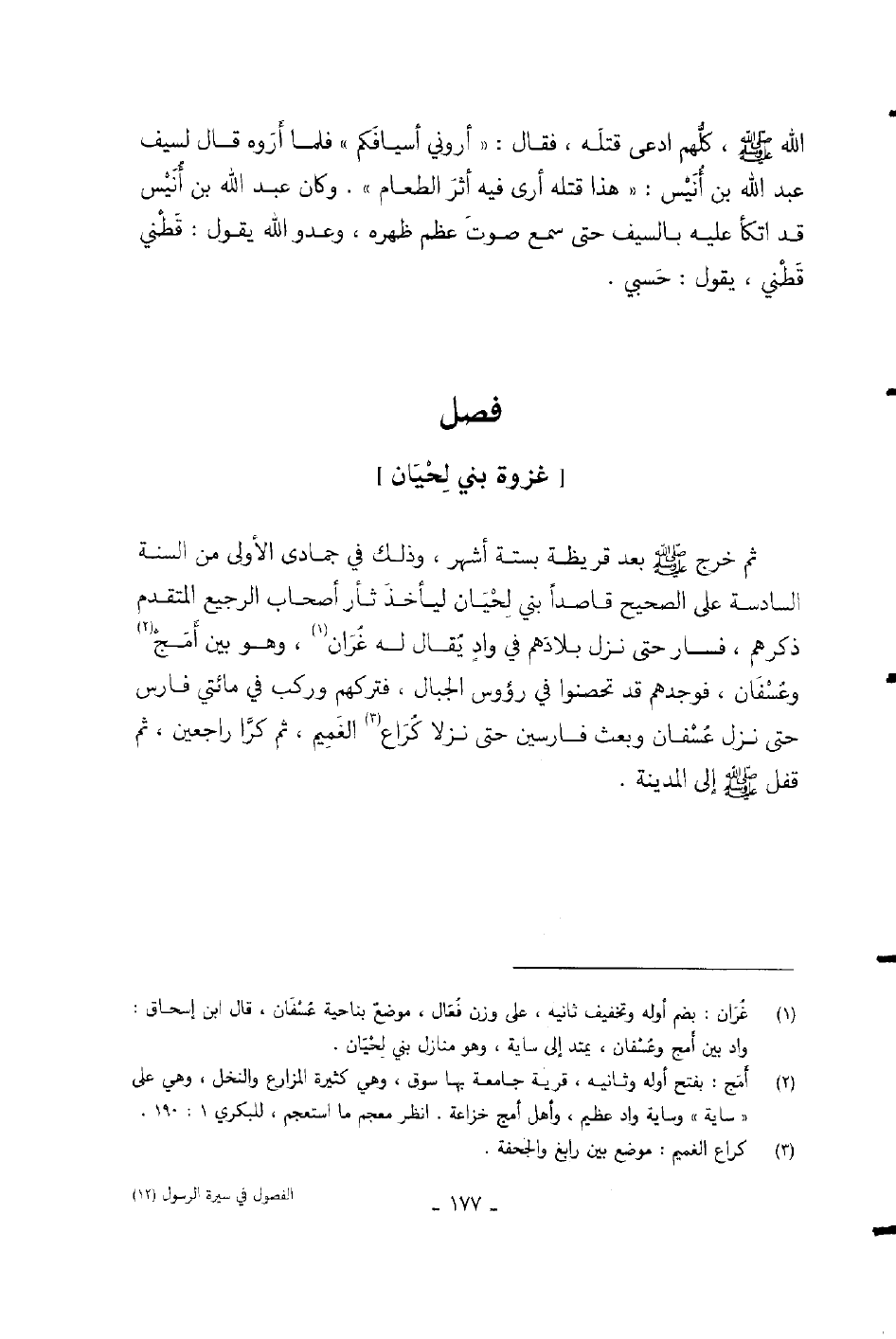 ثم خرج صلى الله عليه وسلم بعد قريظة بستة أشهر، وذلك في جمادى الأولى من السنة السادسة على الصحيح قاصداً بني لحيان ليأخذ ثأر أصحاب الرجيع المتقدم ذكرهم، فسار حتى نزل بلادهم في واد يقال له غران، وهو بين أمج وعسفان، فوجدهم قد تحصنوا في رؤوس الجبال، فتركهم وركب في مائتي فارس حتى نزل عسفان وبعث فارسين حتى نزلا كراع الغميم، ثم كرا راجعين، ثم قفل صلى الله عليه وسلم إلى المدينة.