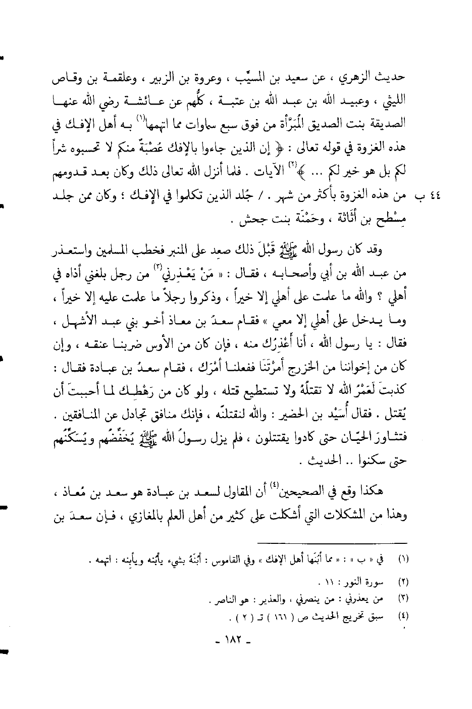 حديث الزهري، عن سعيد بن المسيب، وعروة بن الزبير، وعلقمة بن وقاص الليثي، وعبيد الله بن عبد الله بن عتبة، كلهم عن عائشة رضي الله عنها الصديقة بنت الصديق المبرأة من فوق سبع سماوات مما اتهمها به أهل الإفك في هذه الغزوة في قوله تعالى: {إن الذين جاؤوا بالإفك عصبة منكم لا تحسبوه شرا لكم بل هو خير لكم} الآيات.
