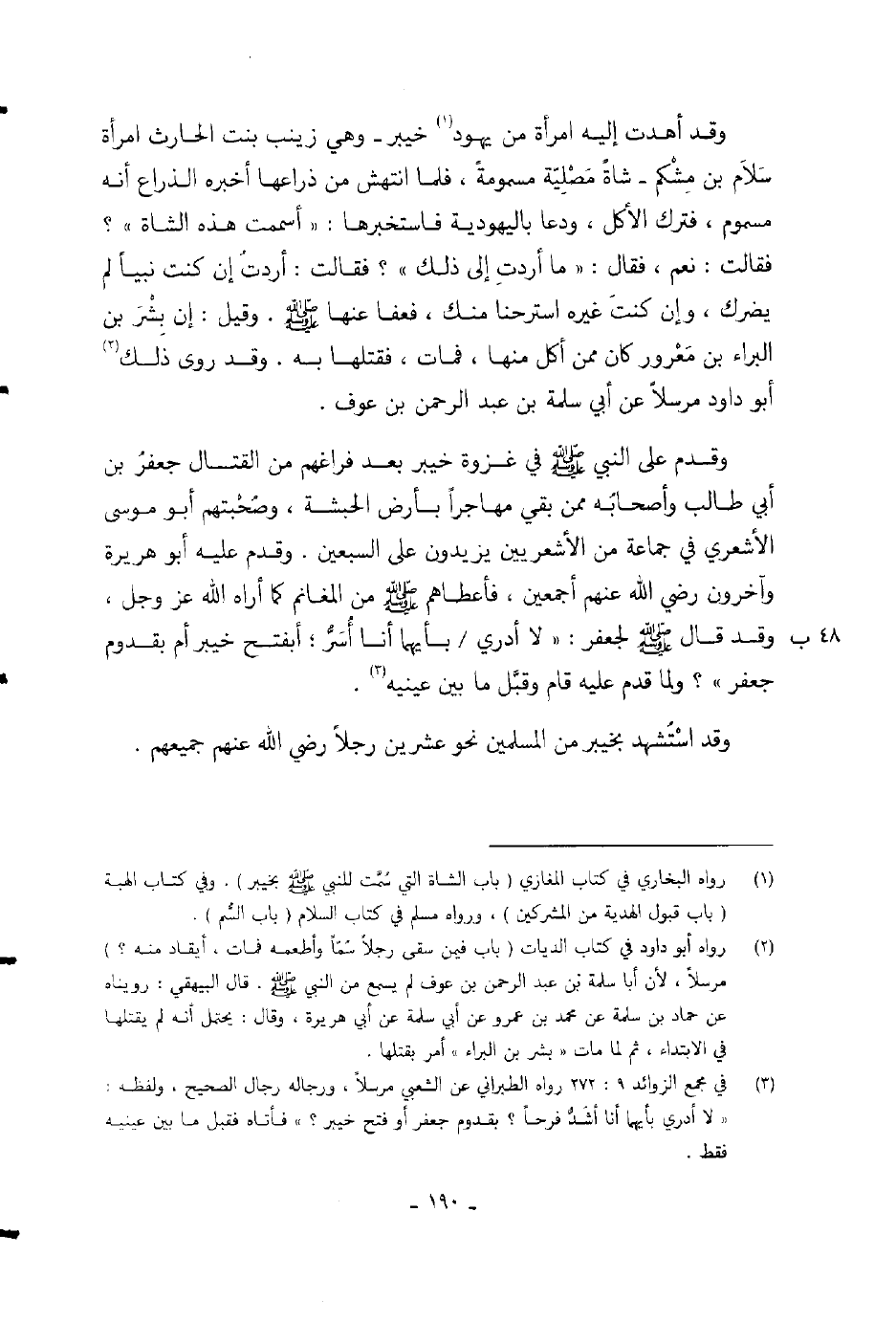قد أهدت إليه امرأة من يهود خيبر ـ وهي زينب بنت الحارث امرأة سلام بن مشكم ـ شاة مصلية مسمومة، فلما انتهش من ذراعها أخبره الذراع أنه مسموم، فترك الأكل، ودعا باليهودية فاستخبرها: [أسممت هذه الشاة] فقالت: نعم، فقال: [ما أردت إلى ذلك] ؟ فقالت: أردت إن كنت نبياً لم يضرك، وإن كنت غيره استرحنا منك، فعفا عنها صلى الله عليه وسلم.